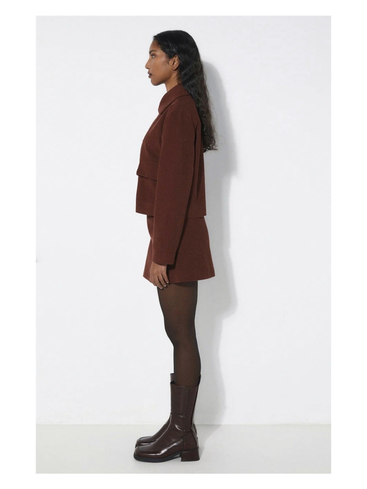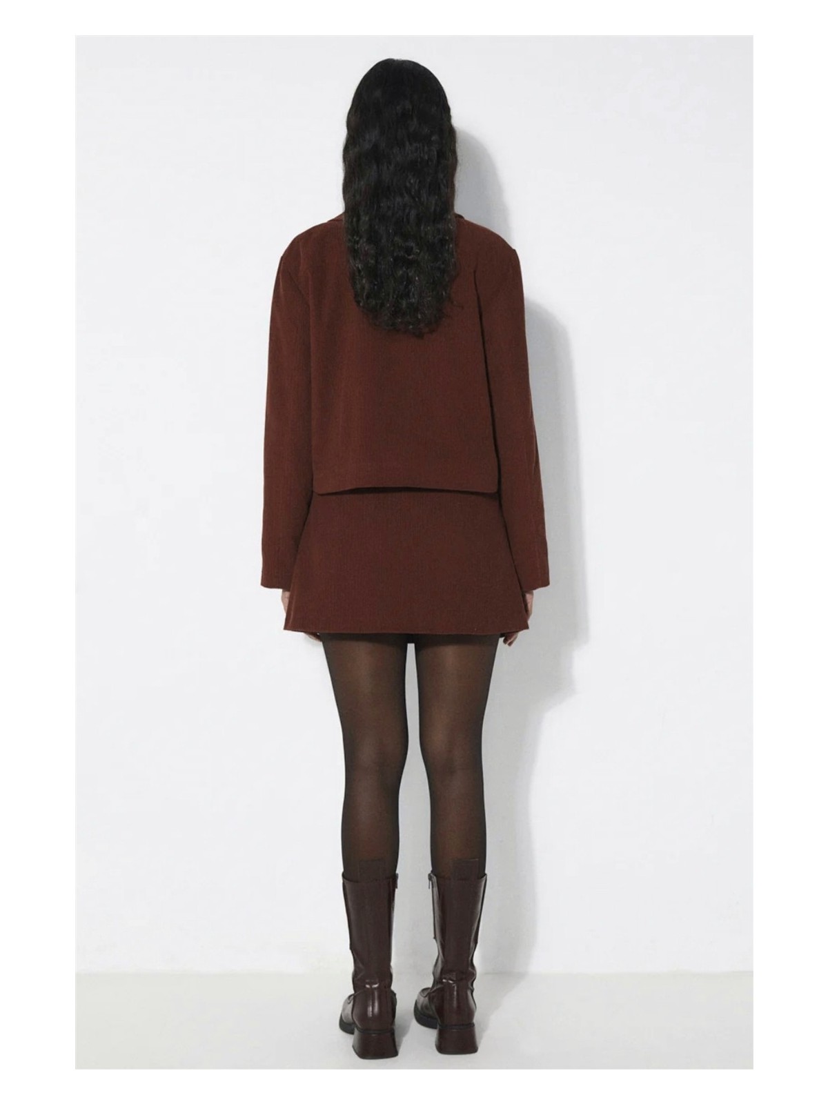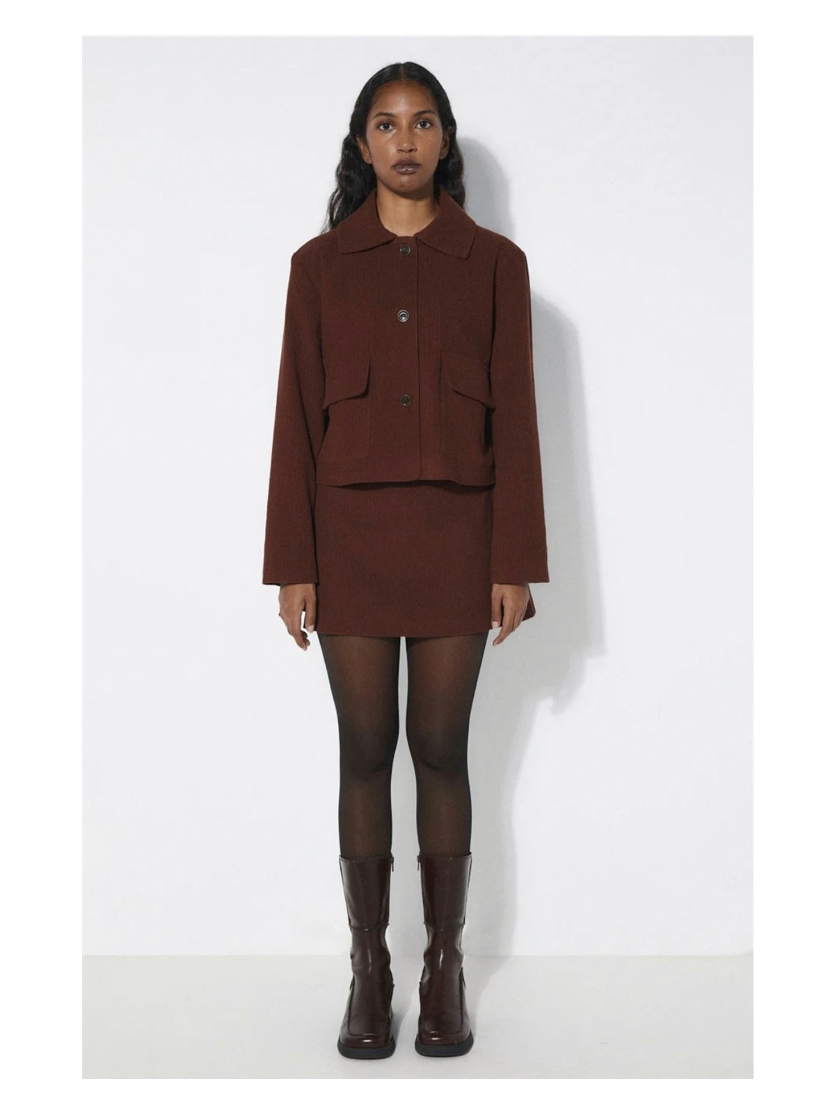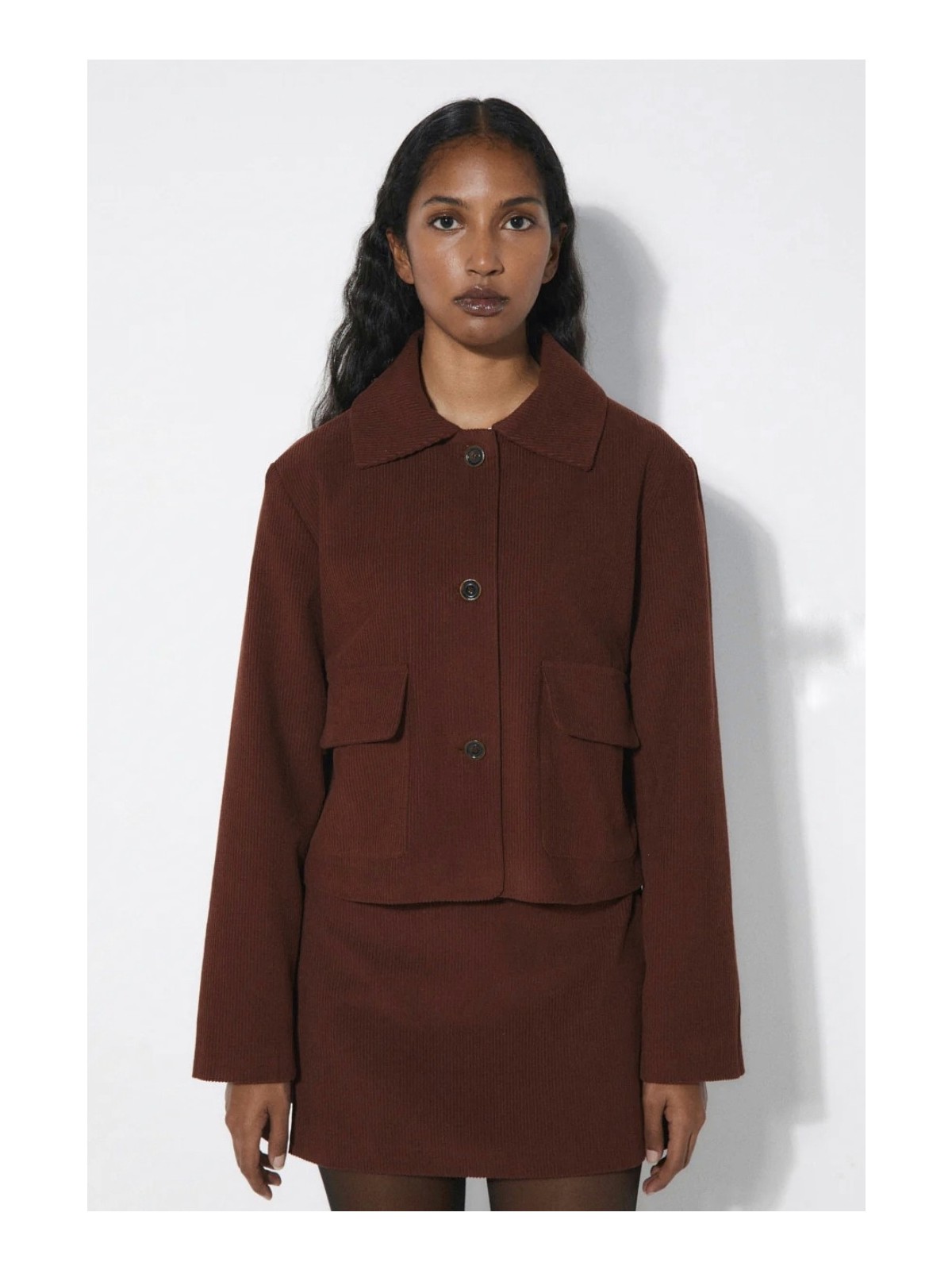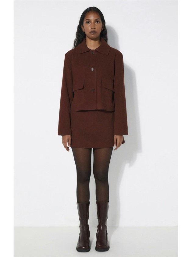 Chaqueta corta de pana en un color marrón agranatado con cuello reondeado, que se ata con botones de color gris en la pante frontal.LLeva bolsillos plastones en la parte delantera.