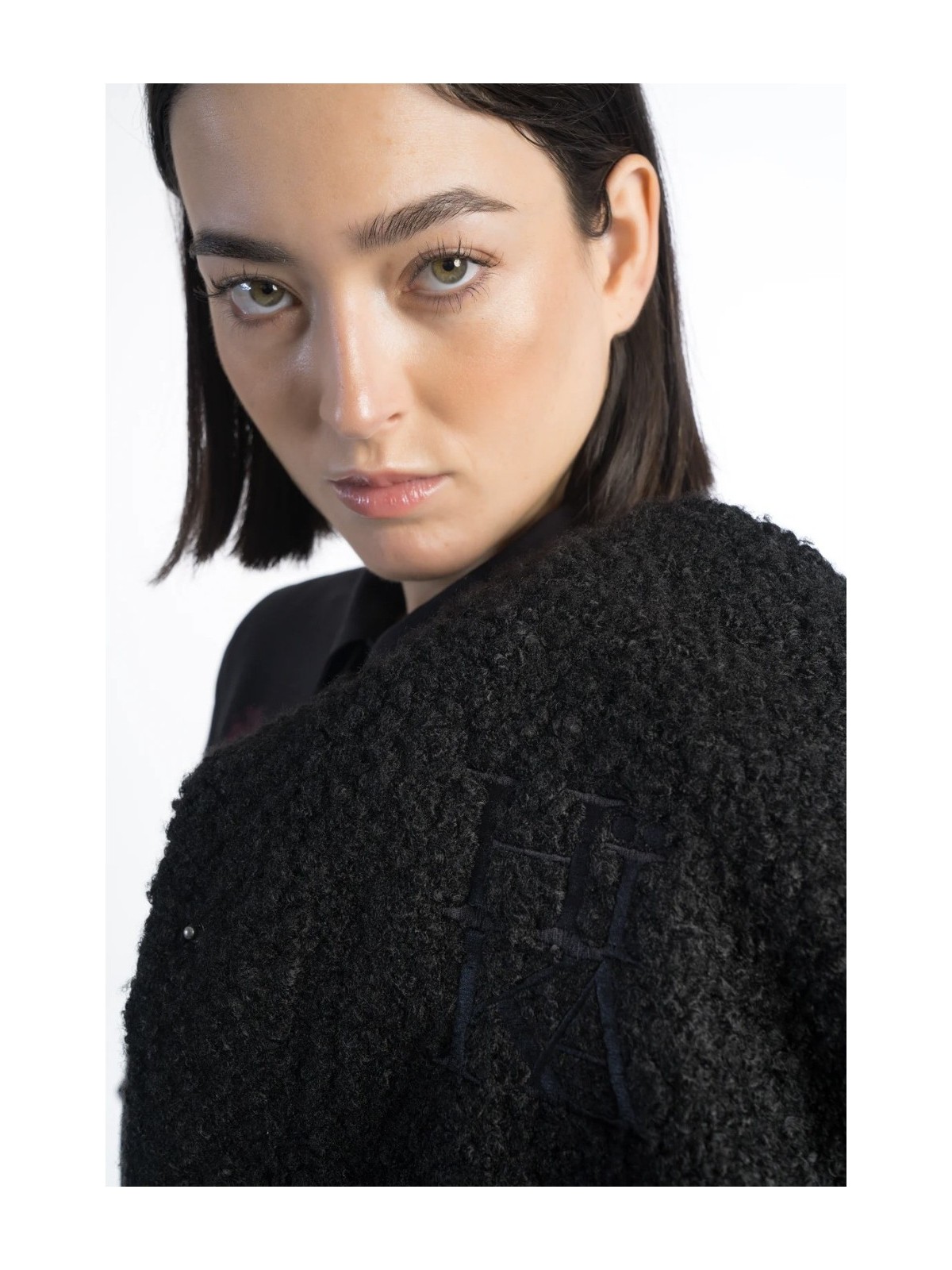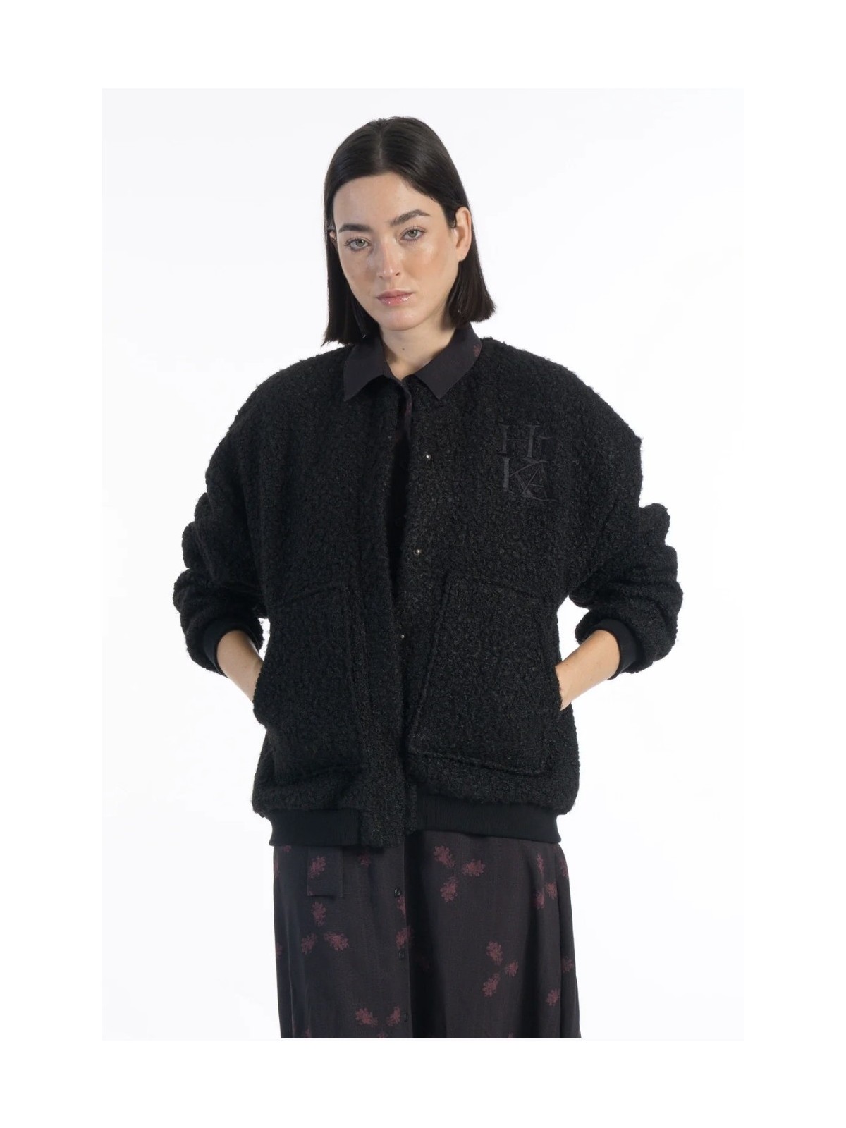 Chaqueta tipo bomber de color negro y de un tejido tipo rizado.Con el logo de la marca bordado en la parte frontal.De cuello mao y con cierre de botón de click.Bolsillos plastón en los laterales.