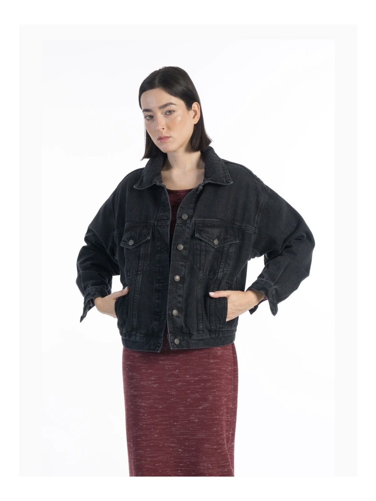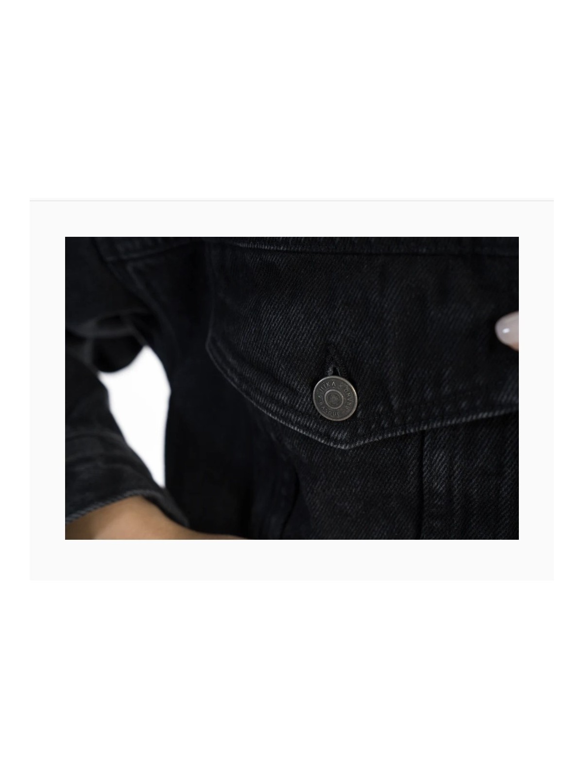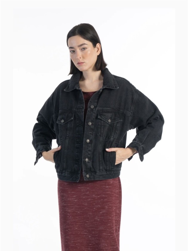 Chaqueta vaquera negra desgastada tipo over.Con bolsillos de tapeta y también laterales.Con botones metálicos.Lleva letras en la espalda y una pequeña etiqueta con el nombre de la marca.