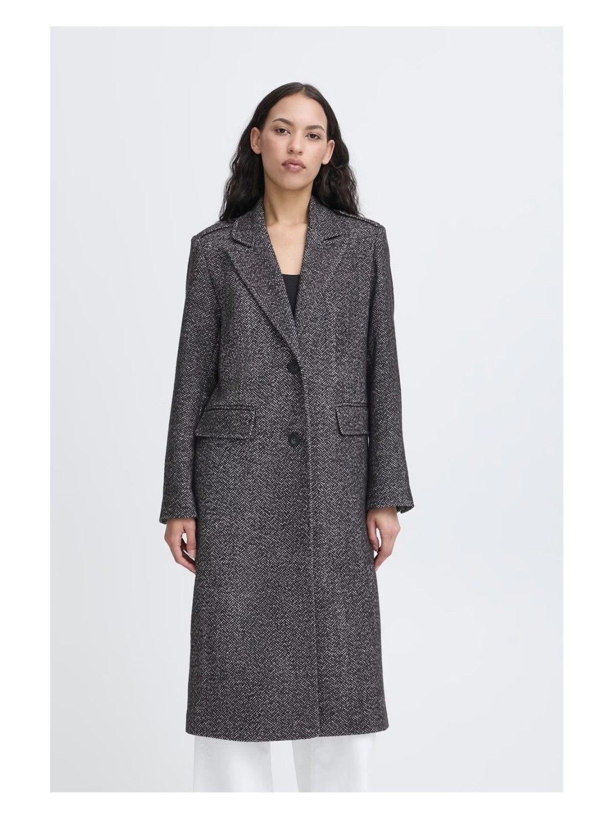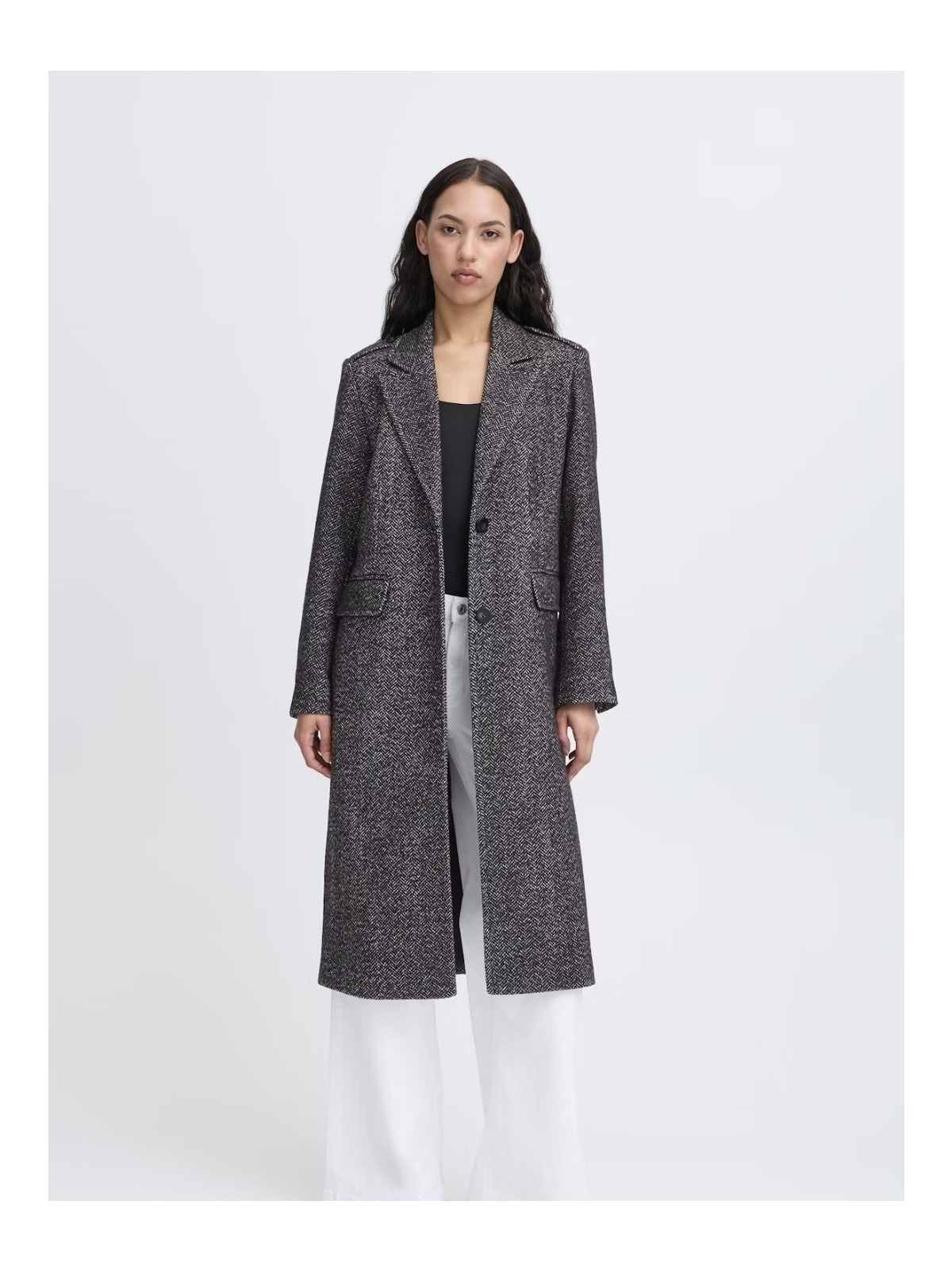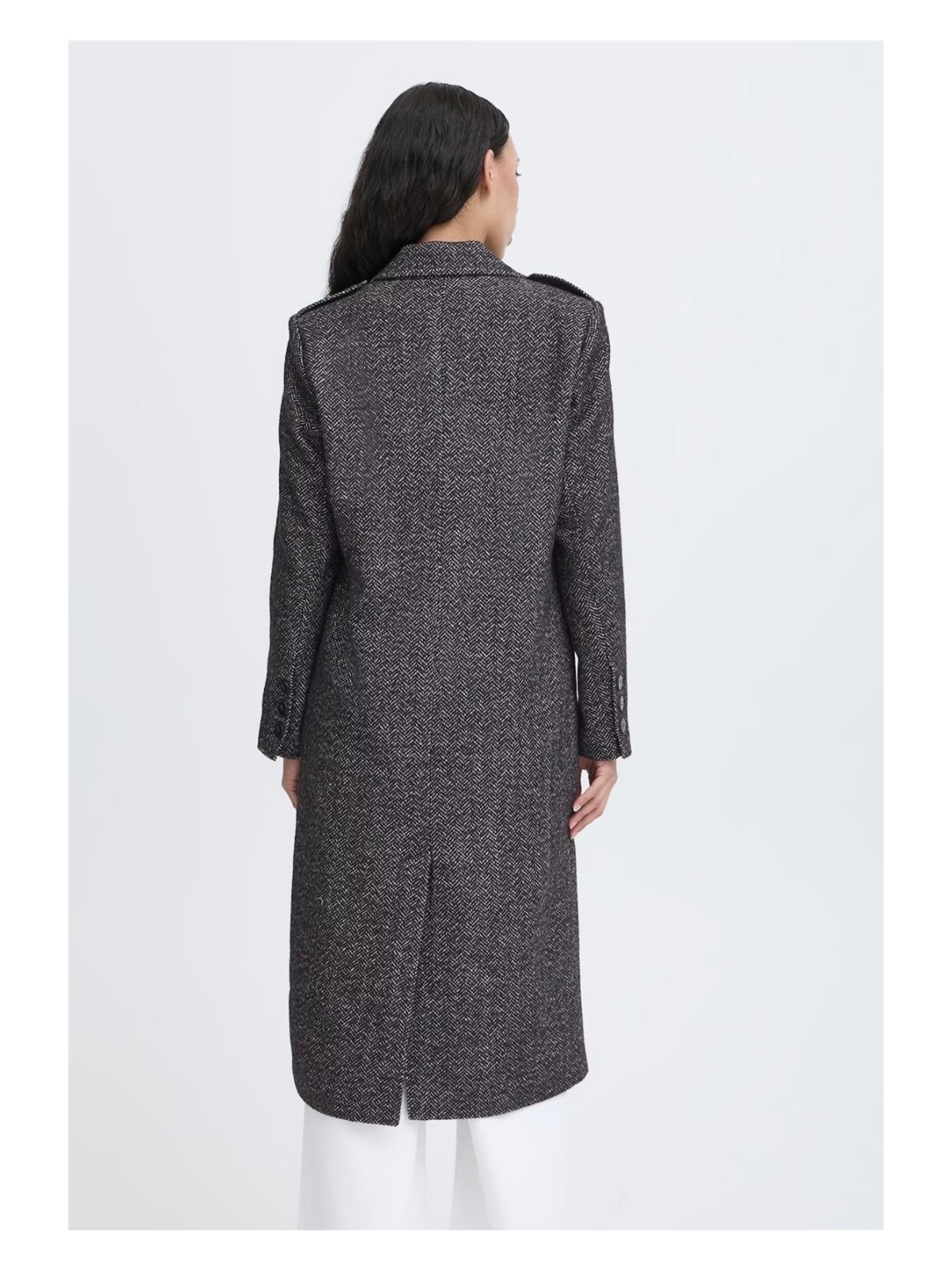 Abrigo jaspeado negro, semi entallado y extra largo.Con bolsillo de tapeta lleva una tira del hombro hasta lel escote.