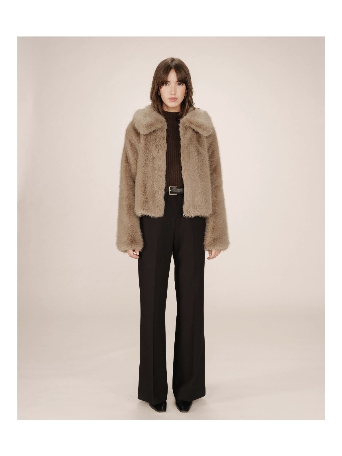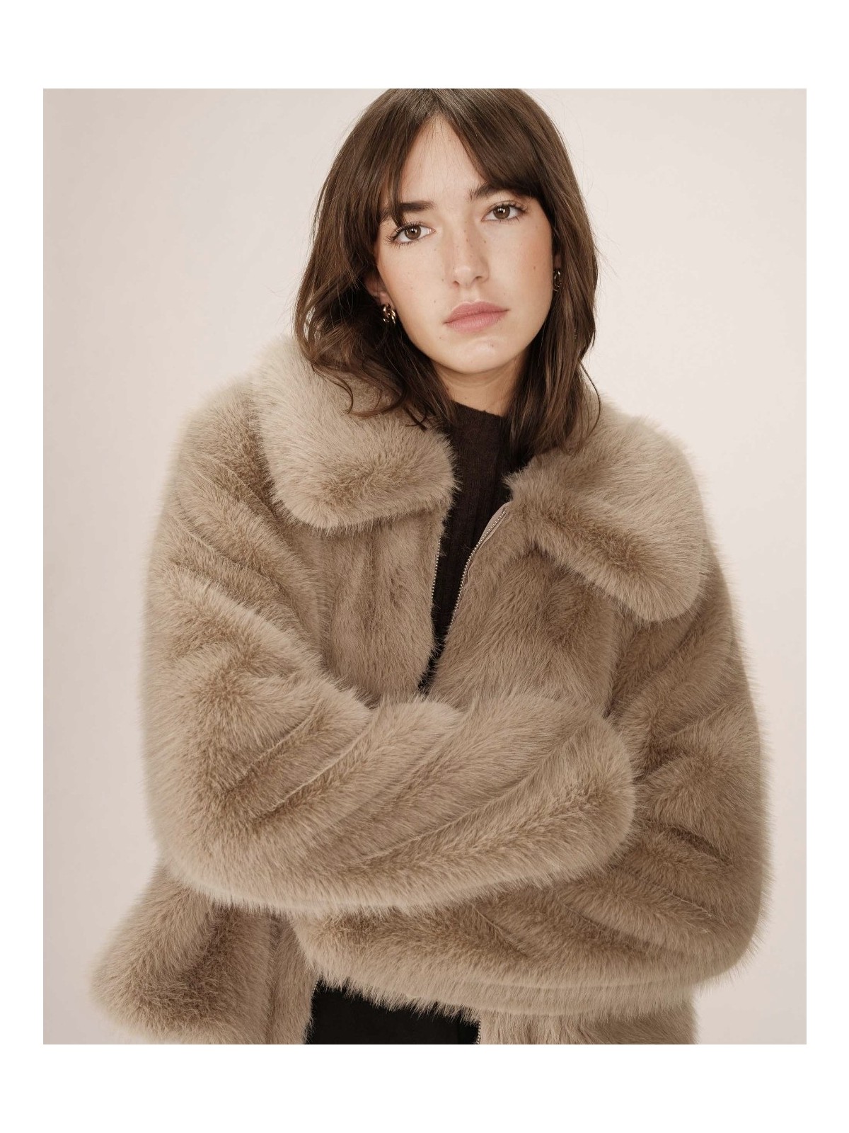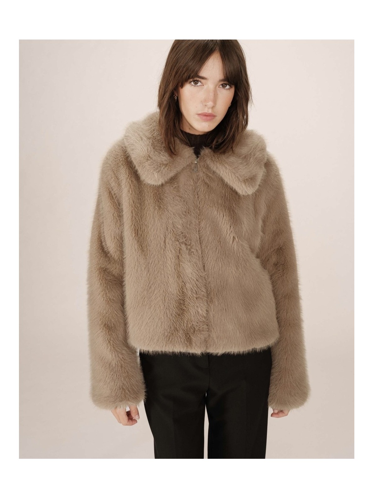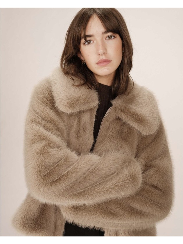 Chaquetón corto de pelo extra suave.Con cuello redondo un poco grande , lo que le dá un toque vintage,Se cierra con cremallera y lleva bolsillos a los costados. Talla grande.