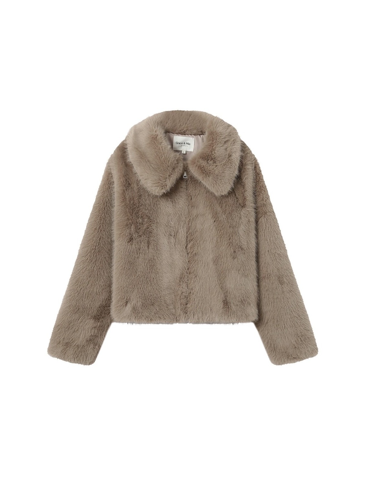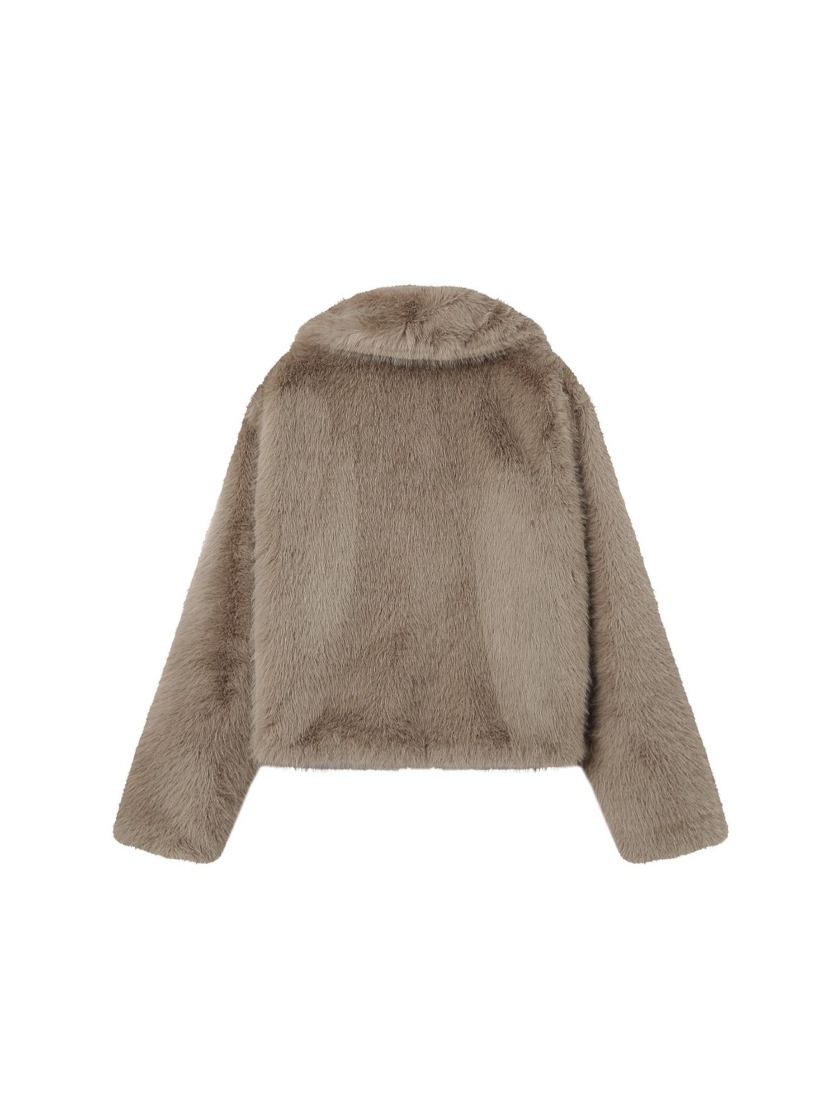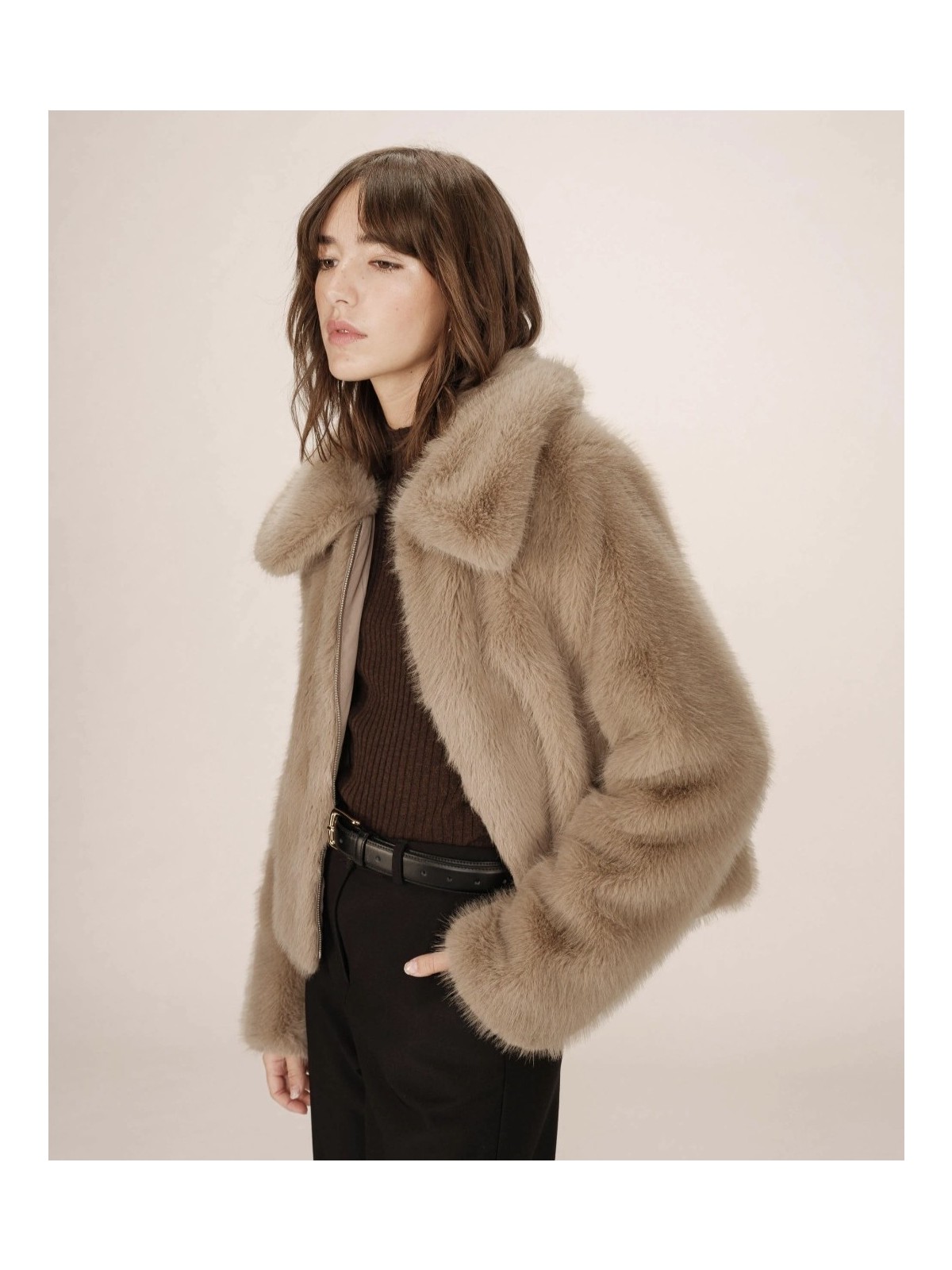 Chaquetón corto de pelo extra suave.Con cuello redondo un poco grande , lo que le dá un toque vintage,Se cierra con cremallera y lleva bolsillos a los costados. Talla grande.