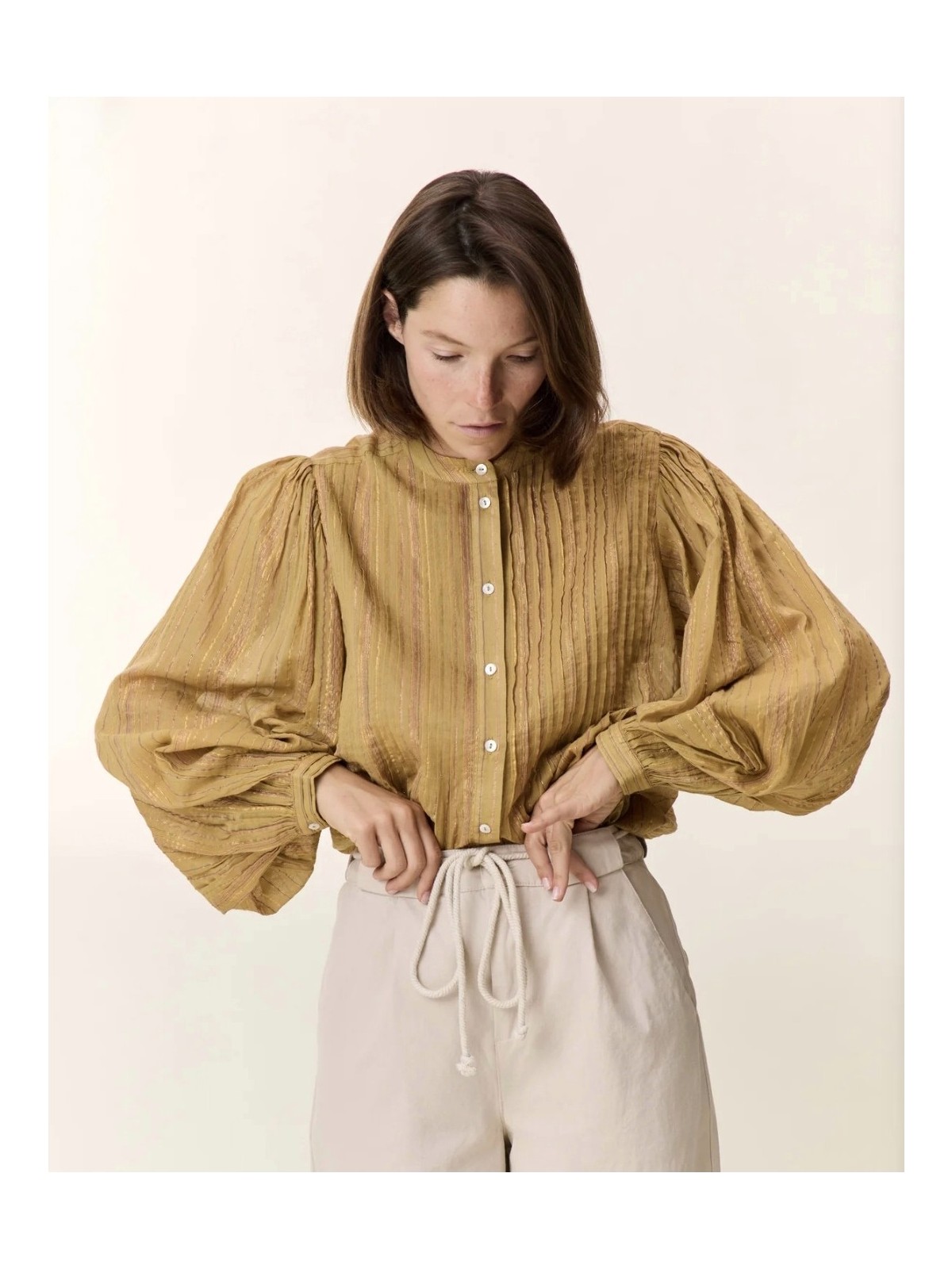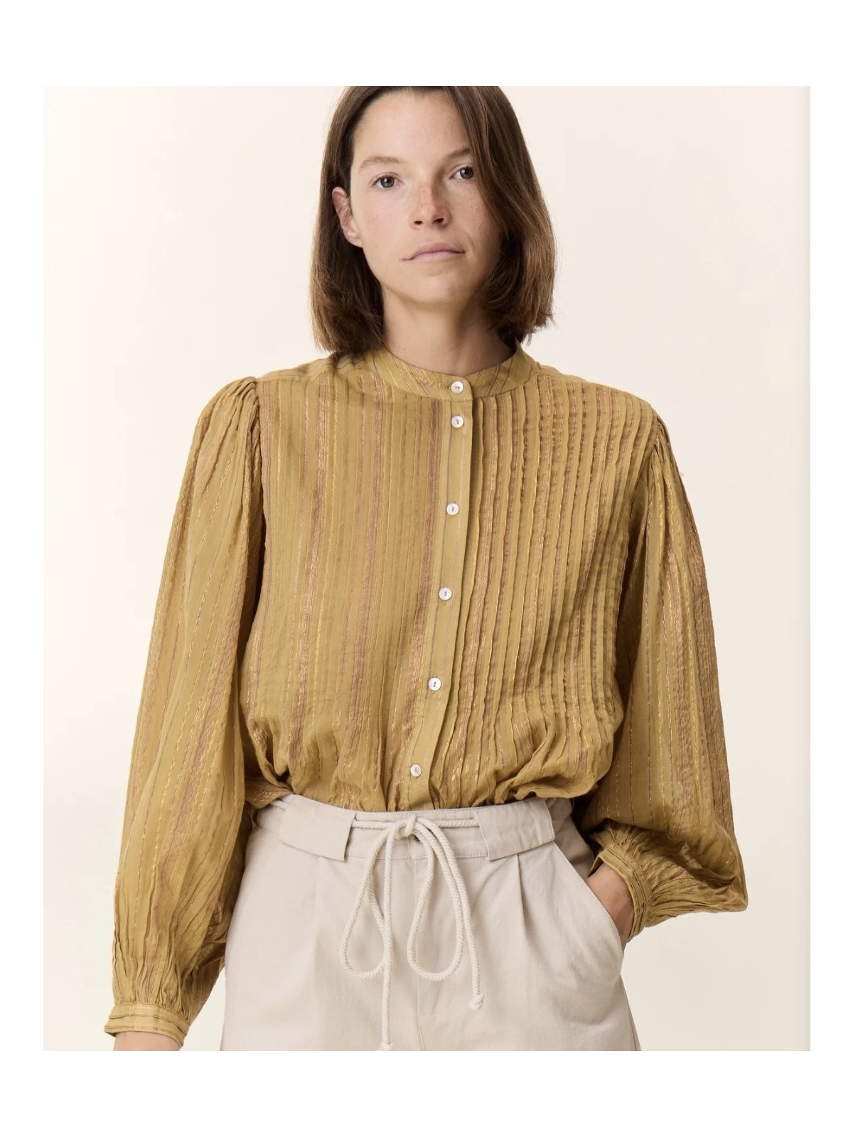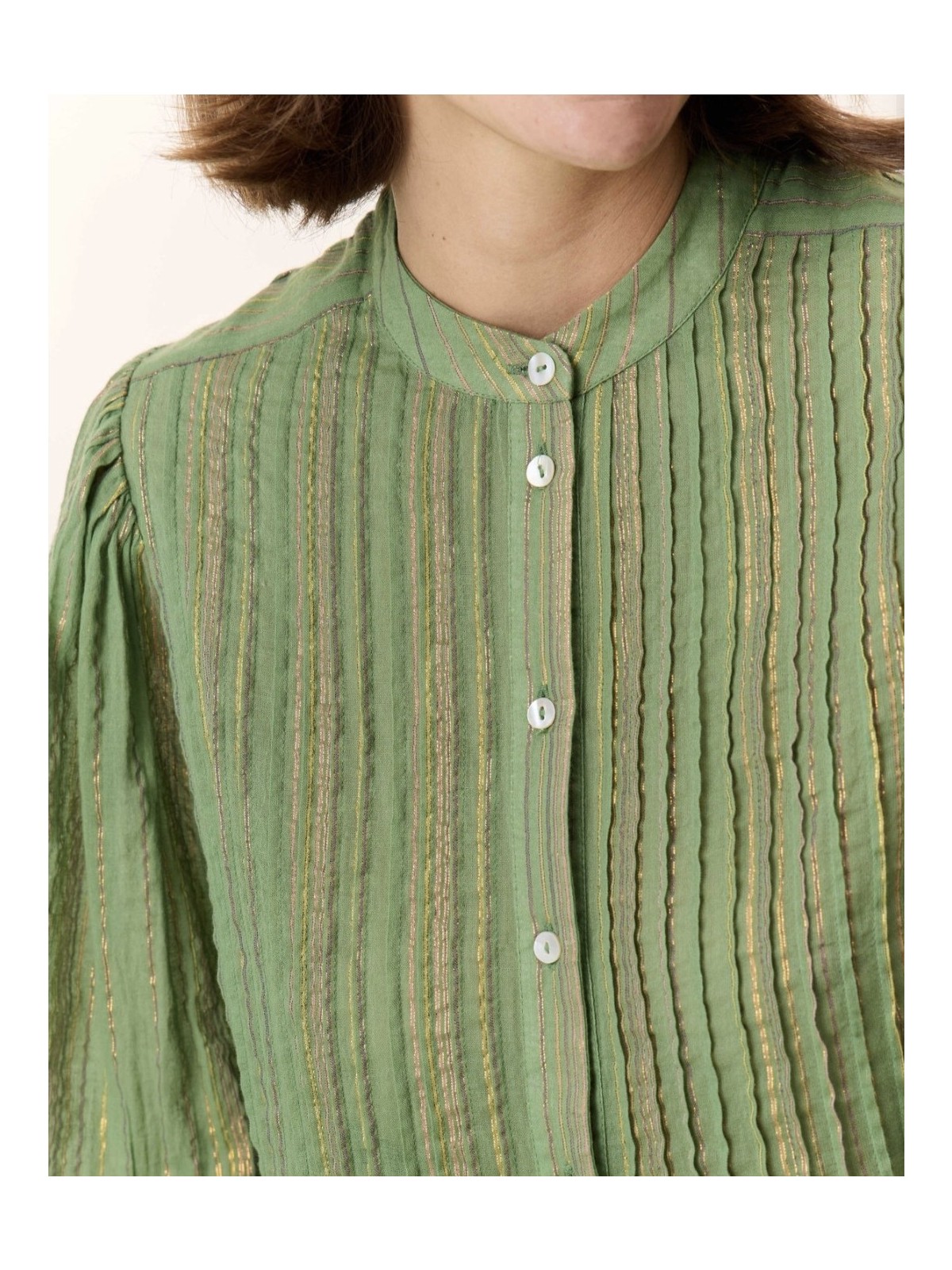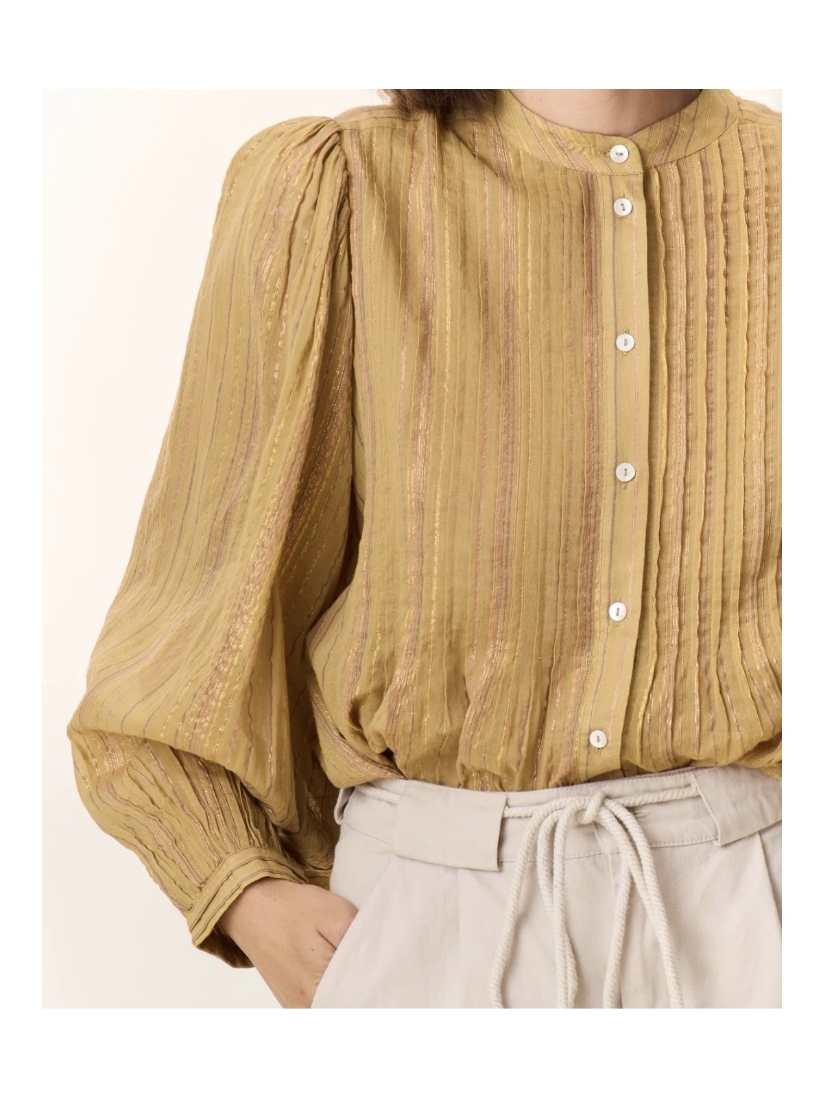 Camisa de cuello mao abotonada por delante con botones de nacar. La tela tiene un hilo de lurex , lo que le dá un brillo especial a la tela. De mangas abullonadas que se atan a la muñeca con puño. La parte frontal de la camisa lleva unos plieges verticales. Composición: 95% algodón 5% lurex