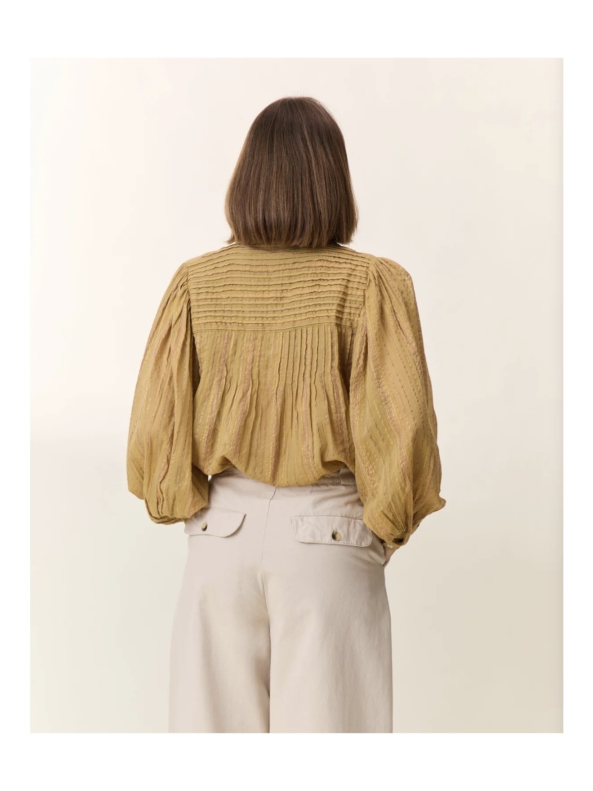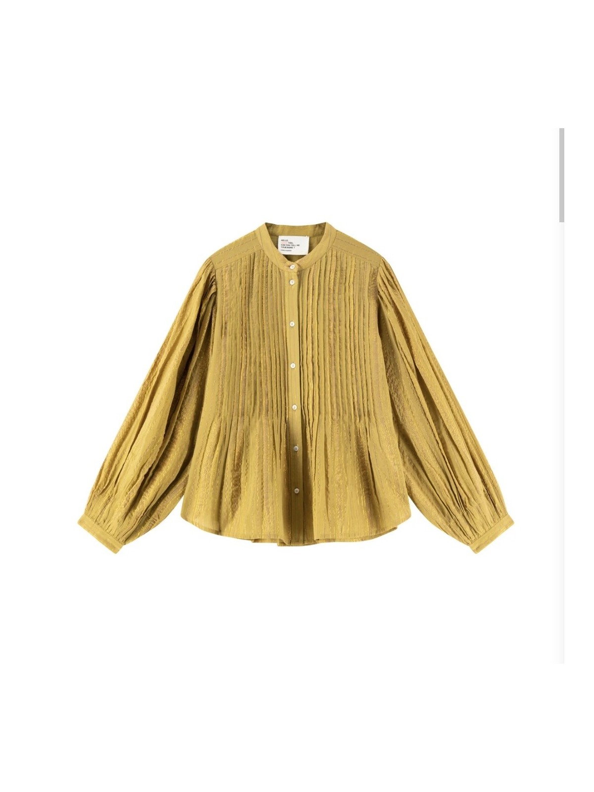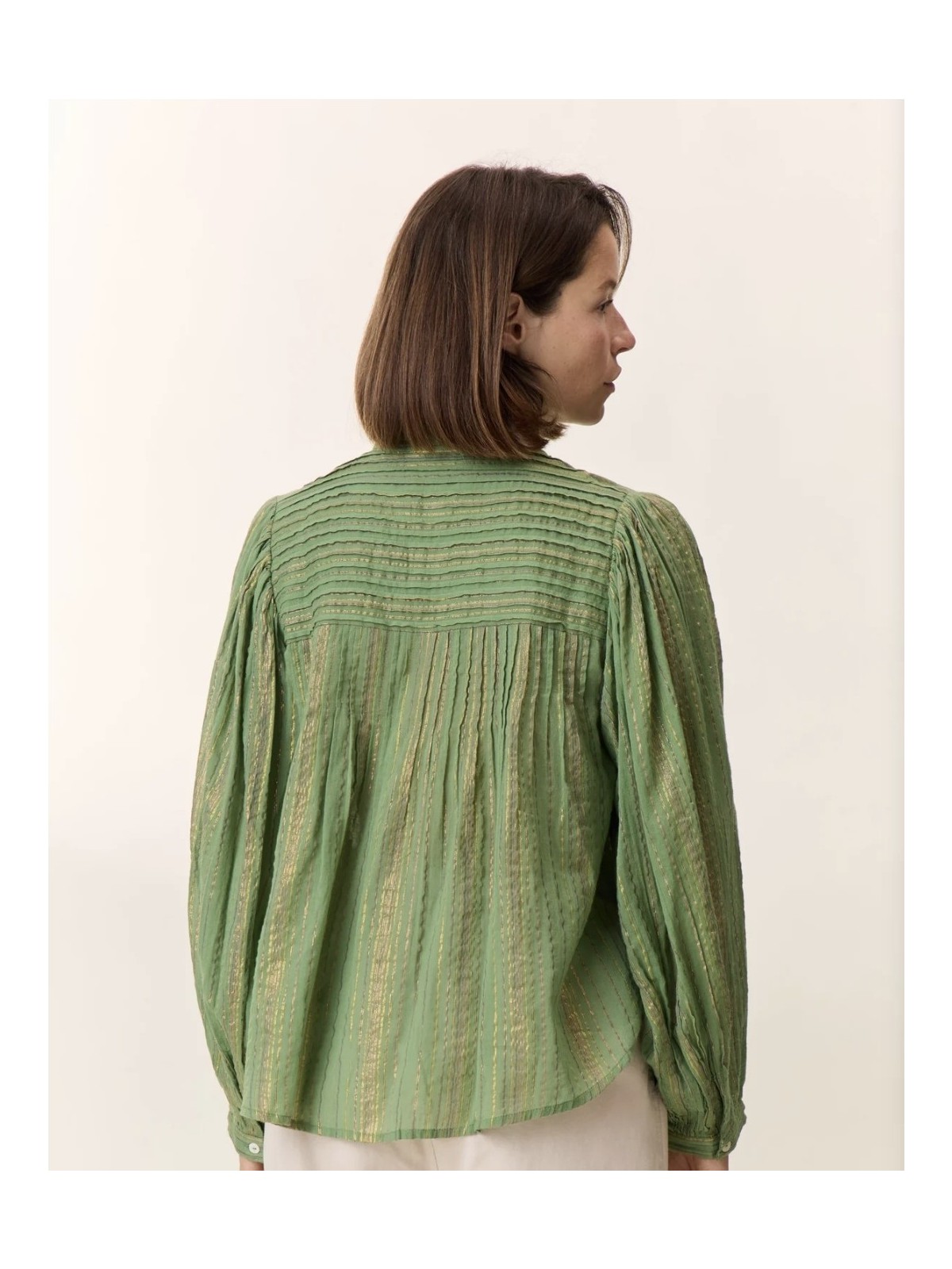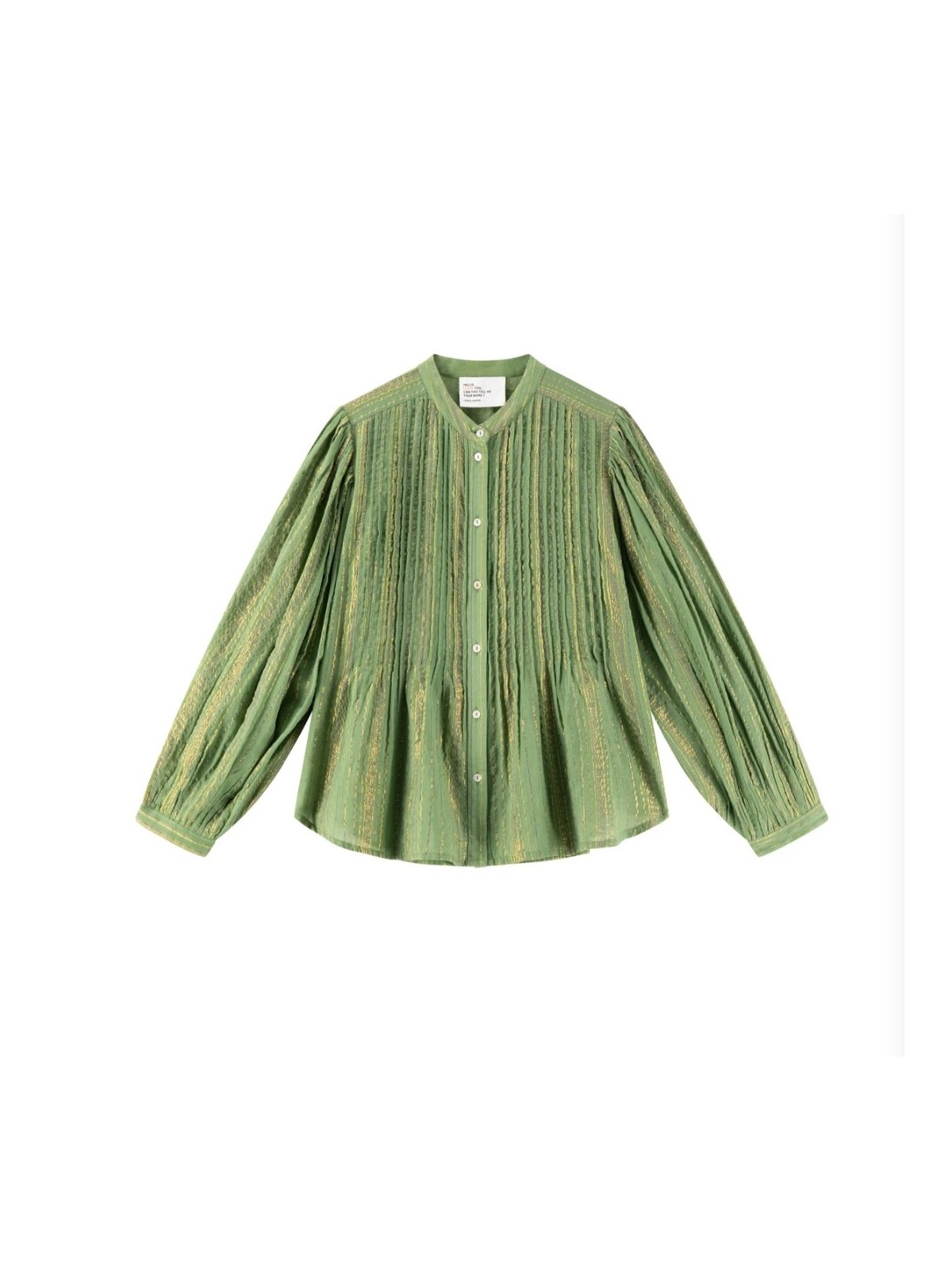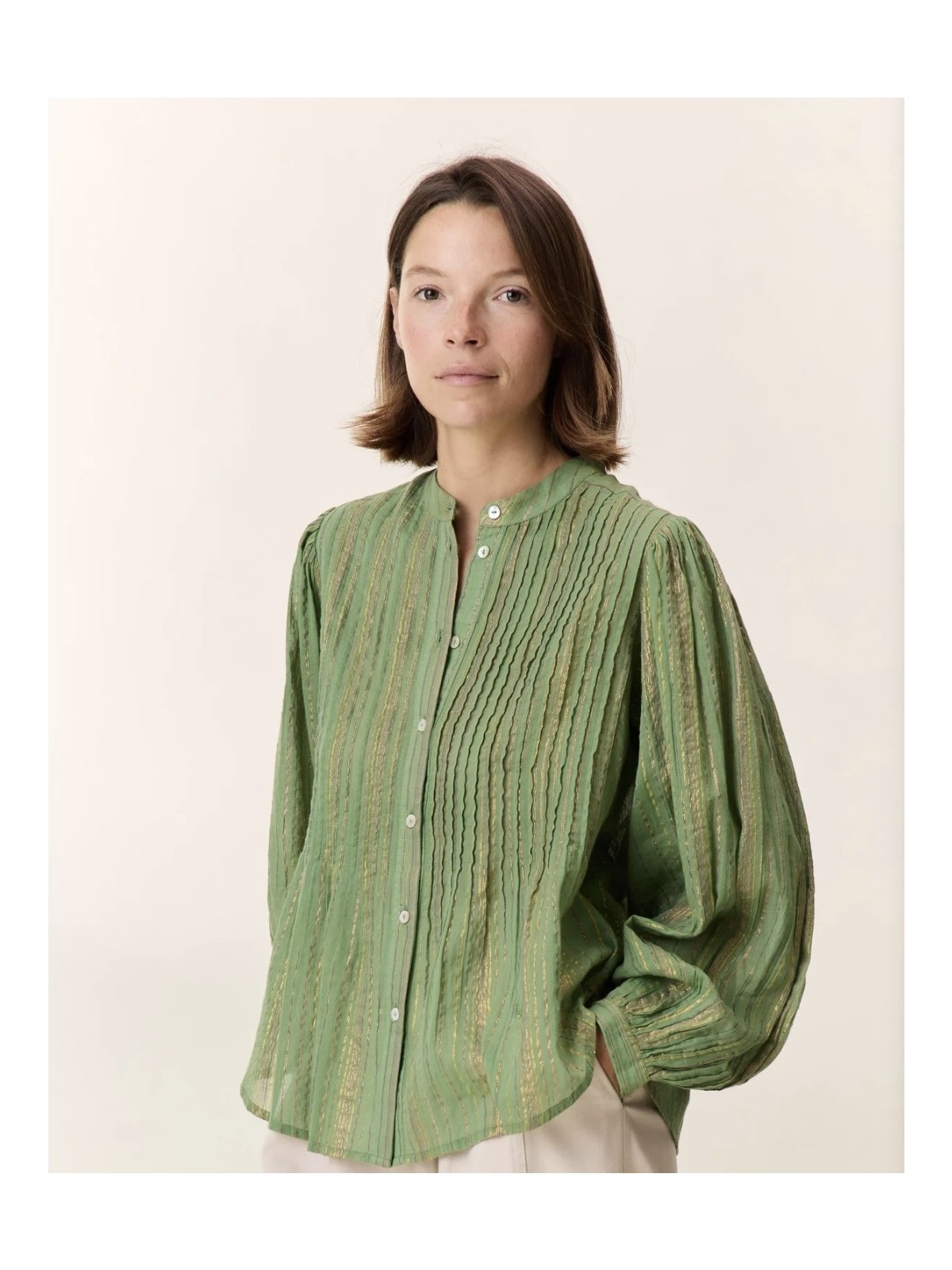 Camisa de cuello mao abotonada por delante con botones de nacar. La tela tiene un hilo de lurex , lo que le dá un brillo especial a la tela. De mangas abullonadas que se atan a la muñeca con puño. La parte frontal de la camisa lleva unos plieges verticales. Composición: 95% algodón 5% lurex