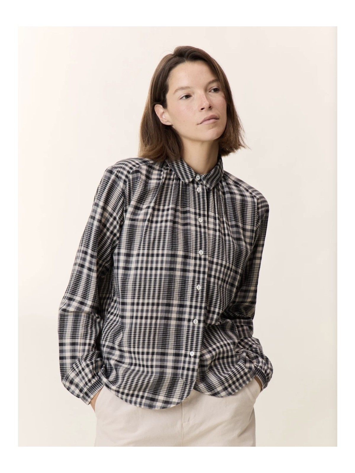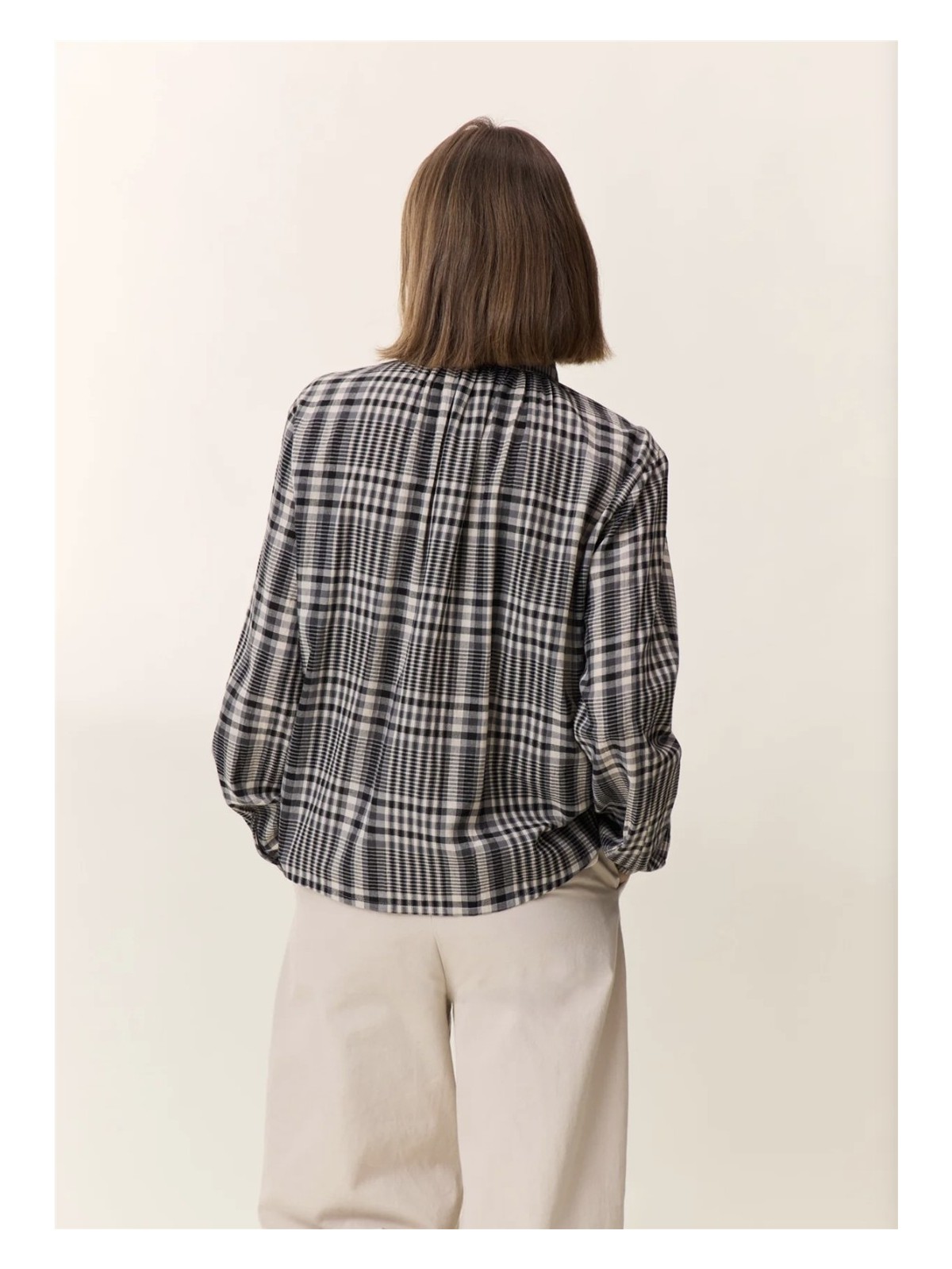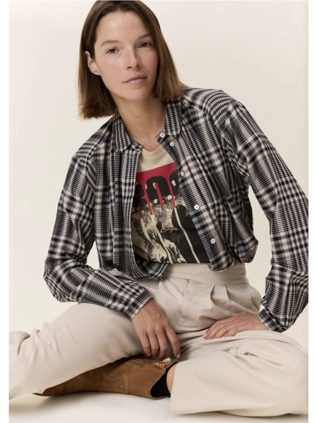 Camisa de cuadros con cuello pequeño y que se abotona en la parte frontal.De estructura holgada, es un modelo que talla amplio.Algodón 100%.