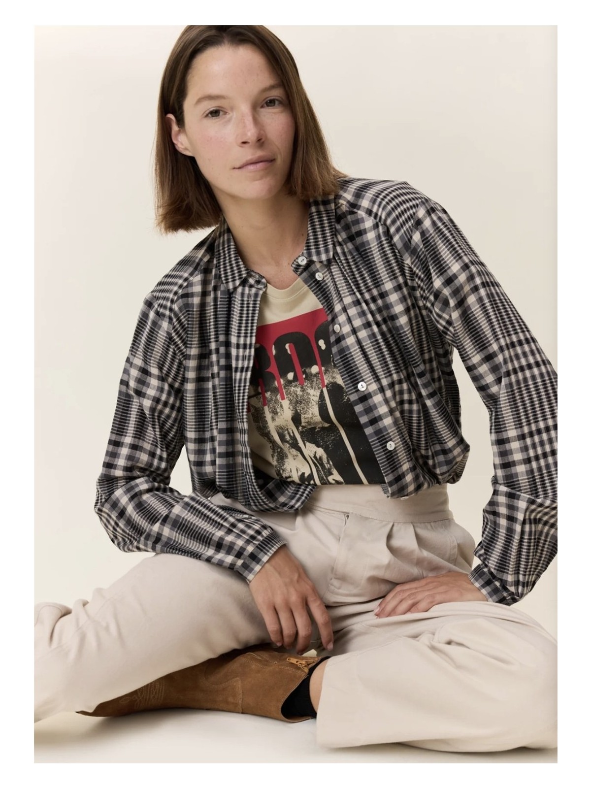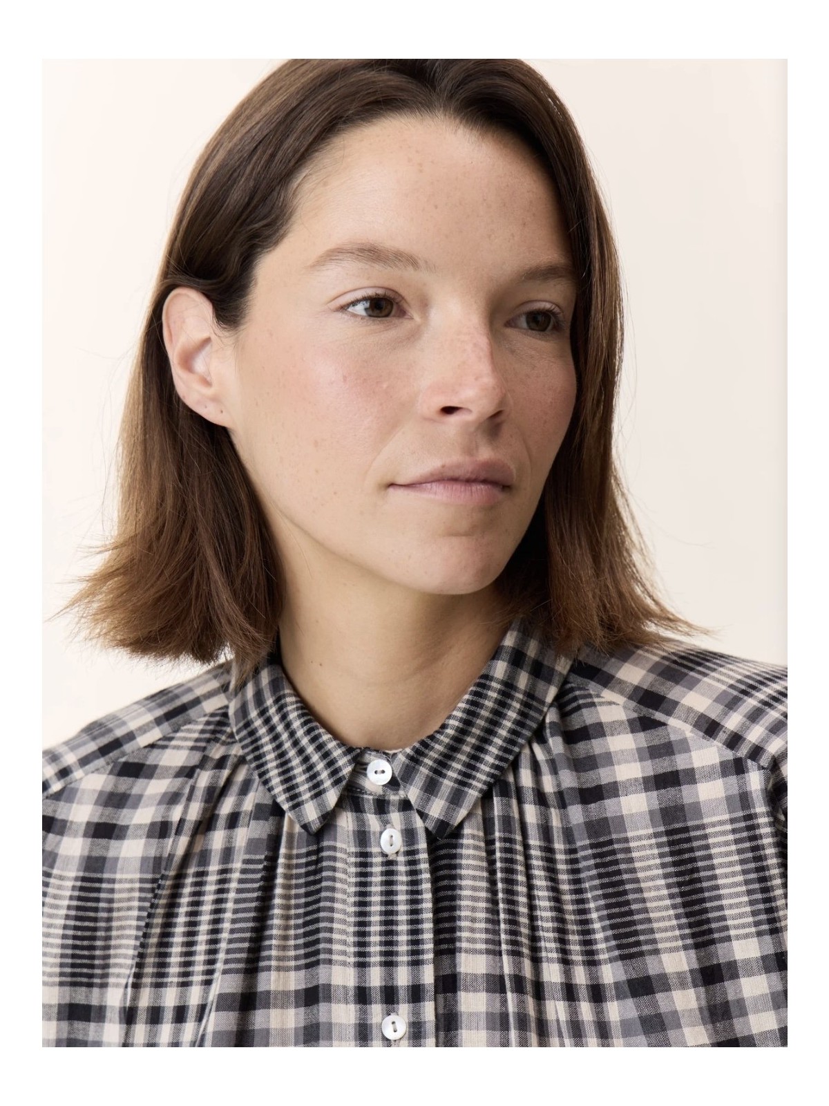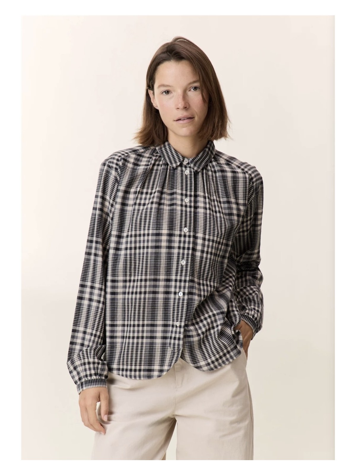 Camisa de cuadros con cuello pequeño y que se abotona en la parte frontal.De estructura holgada, es un modelo que talla amplio.Algodón 100%.
