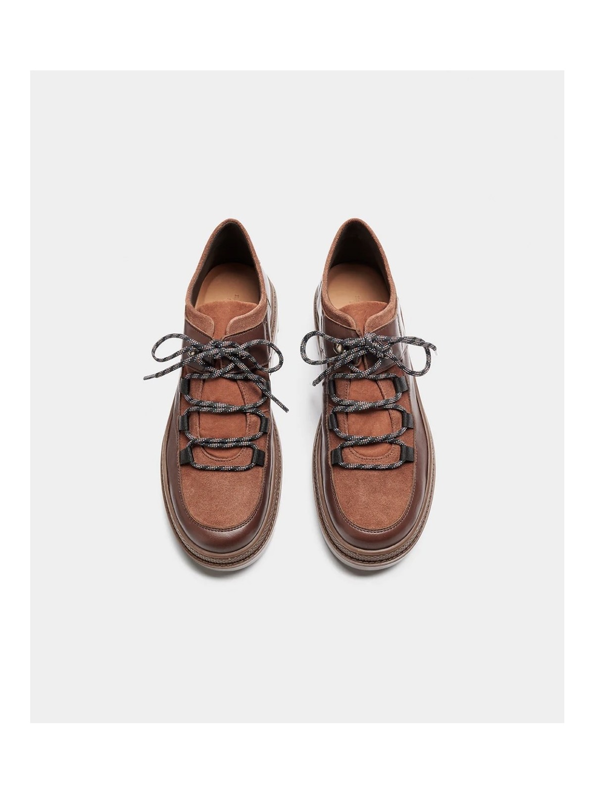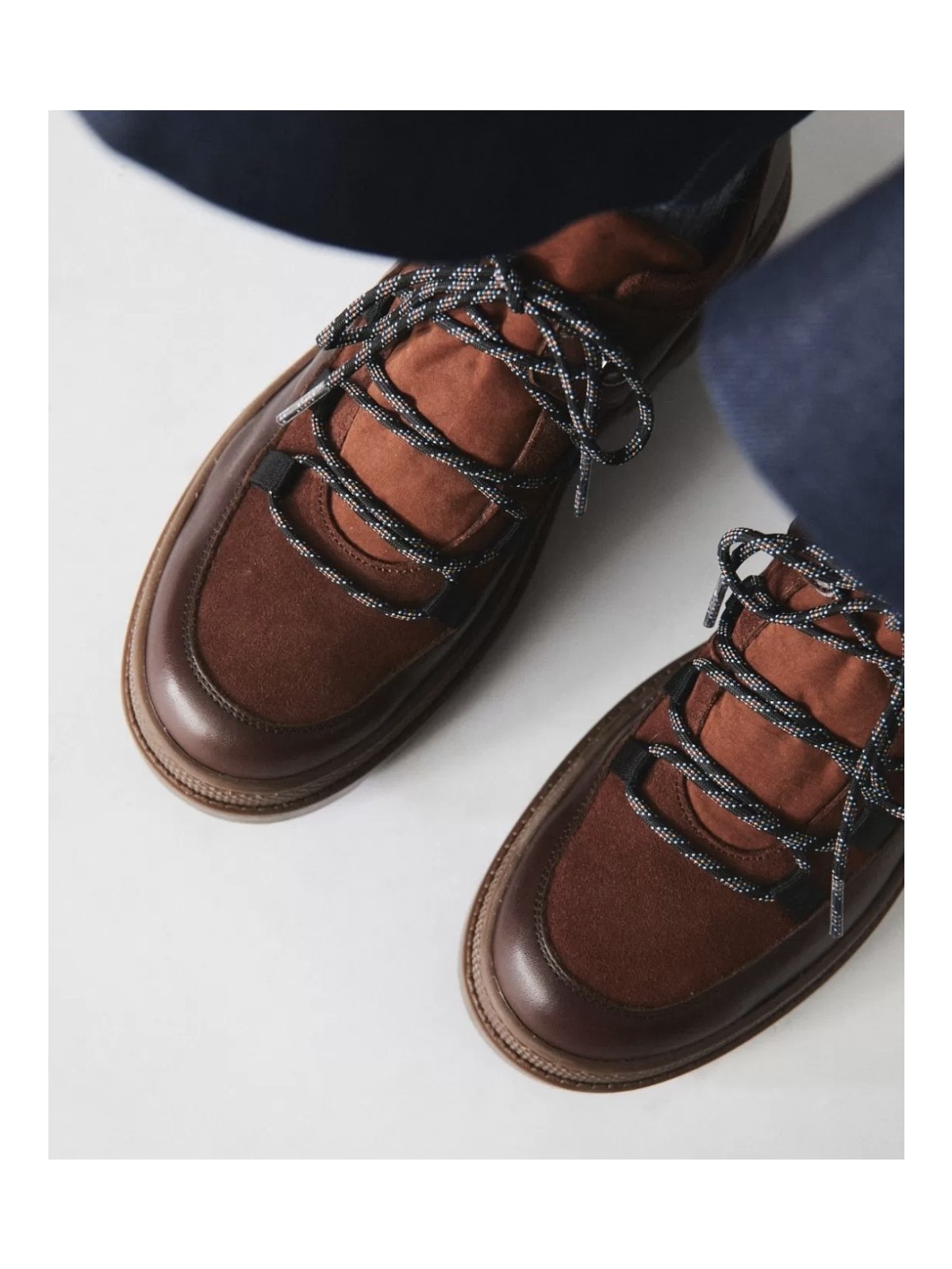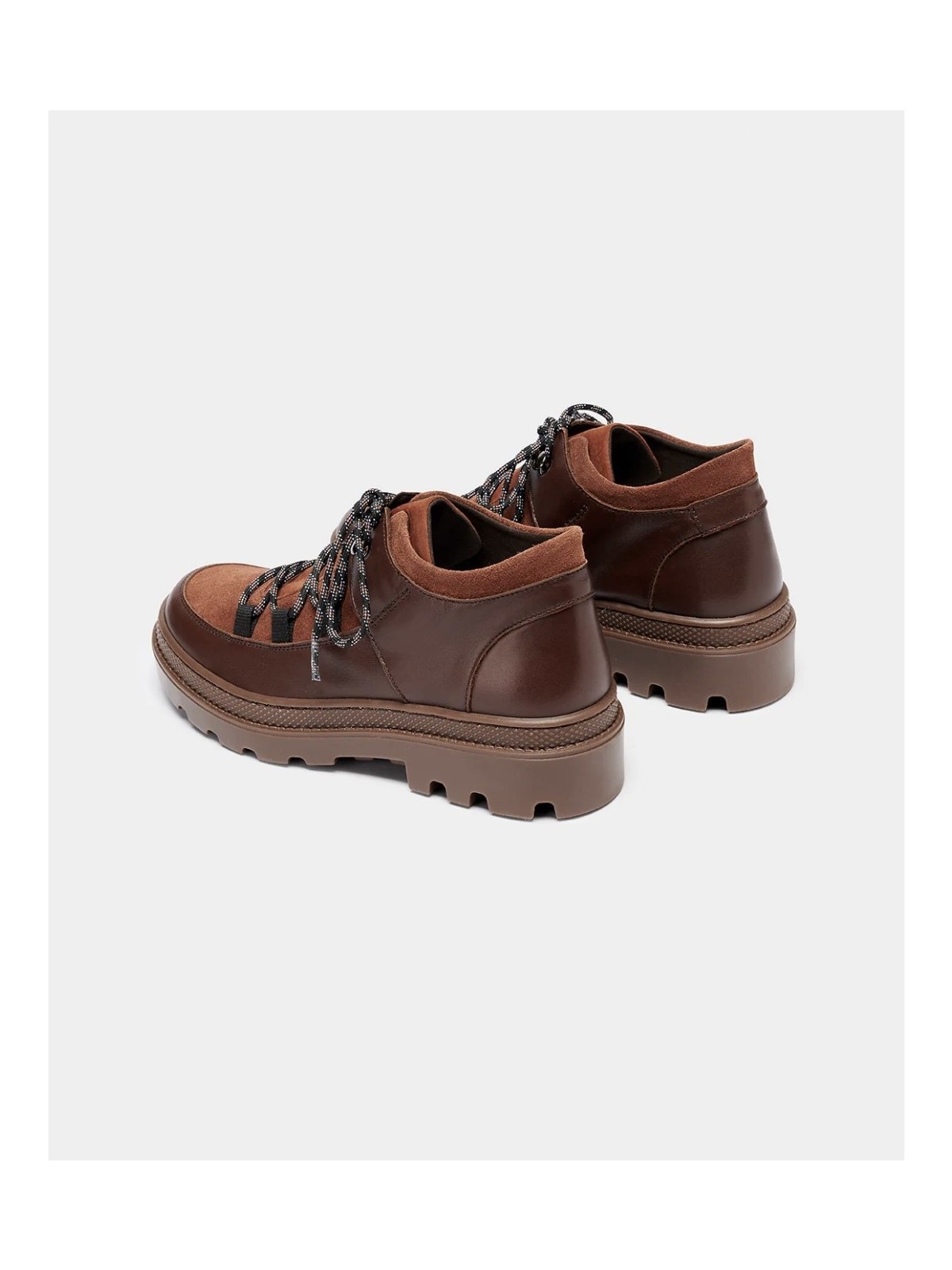 Abra es un botín bajo inspirado en el calzado de montaña.Combina la piel de vacuno en marrón, con serraje de color cognac que se atan con cordón de color negro jaspeado.Suela gruesa track de TR.Lleva plantilla extraíble. La altura del piso es de 3.5cm.para mayor comodidad