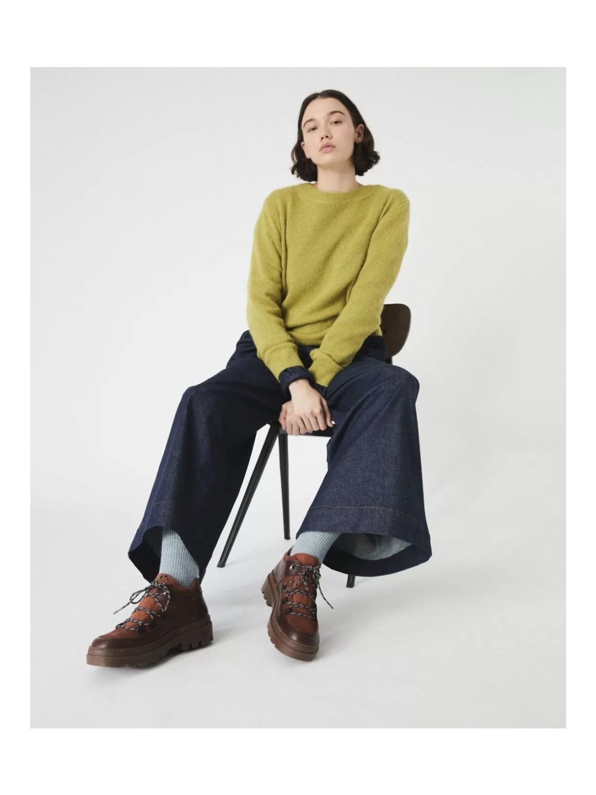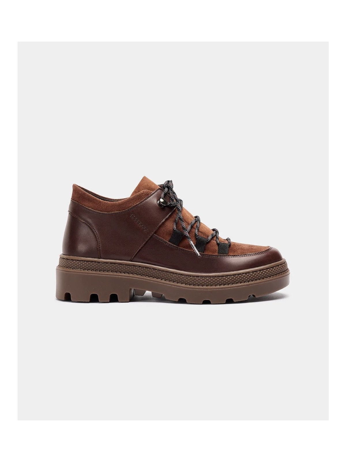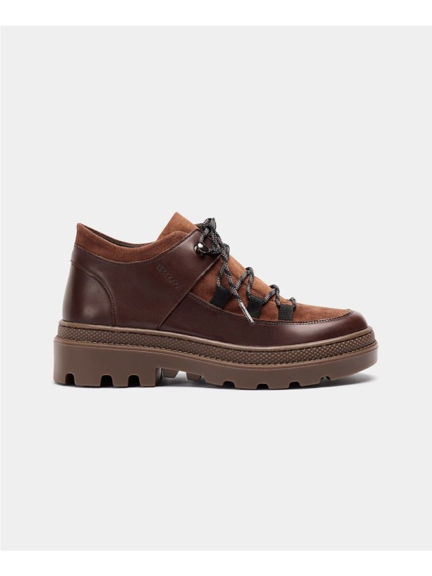 Abra es un botín bajo inspirado en el calzado de montaña.Combina la piel de vacuno en marrón, con serraje de color cognac que se atan con cordón de color negro jaspeado.Suela gruesa track de TR.Lleva plantilla extraíble. La altura del piso es de 3.5cm.para mayor comodidad