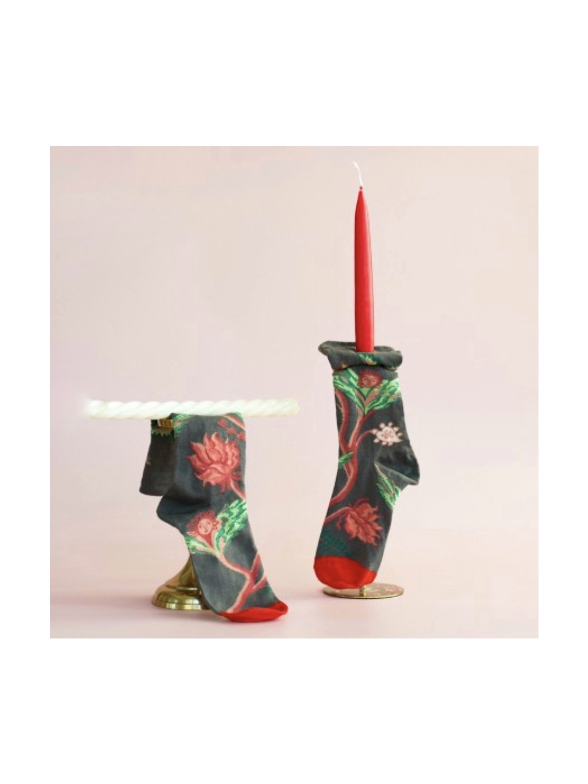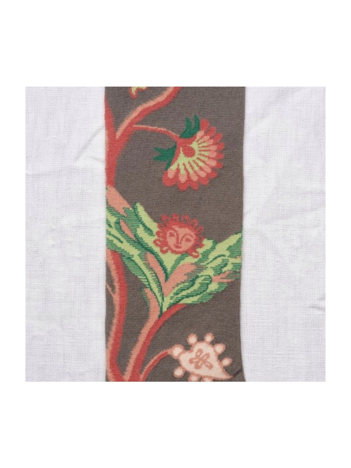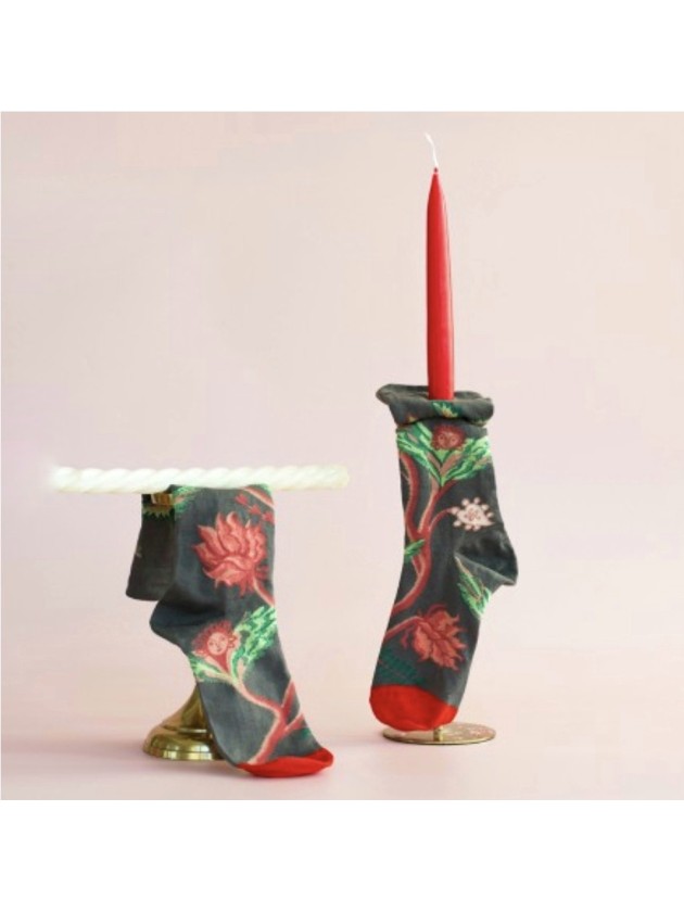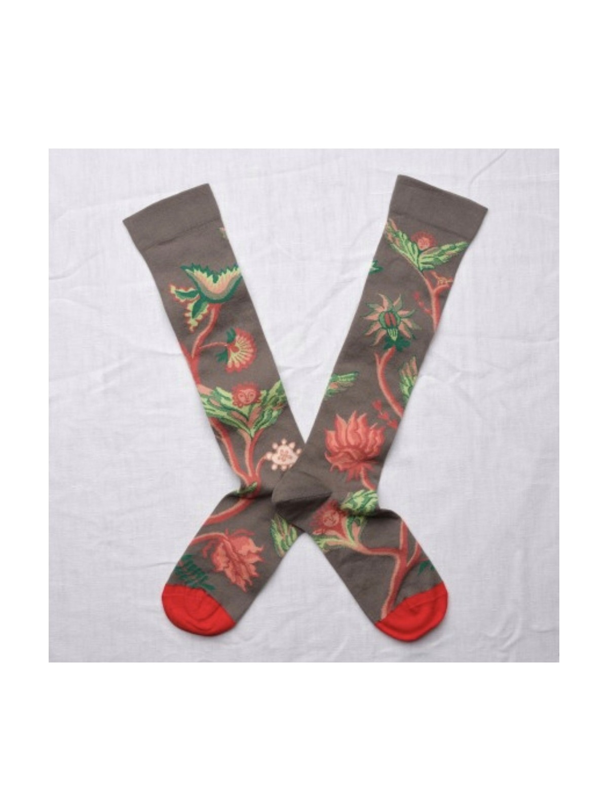 Media de color visón con estampación en colore naranja quemado y verdes y con puntera en color rojo.Composición: Algodón 90%, Poliester 8%, Elastan 2%.