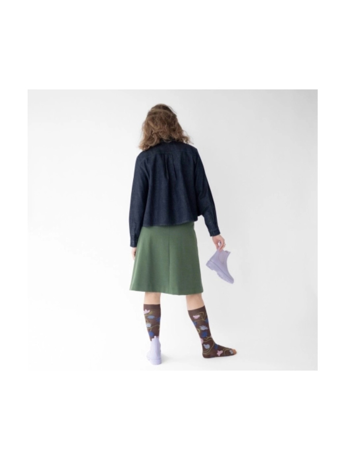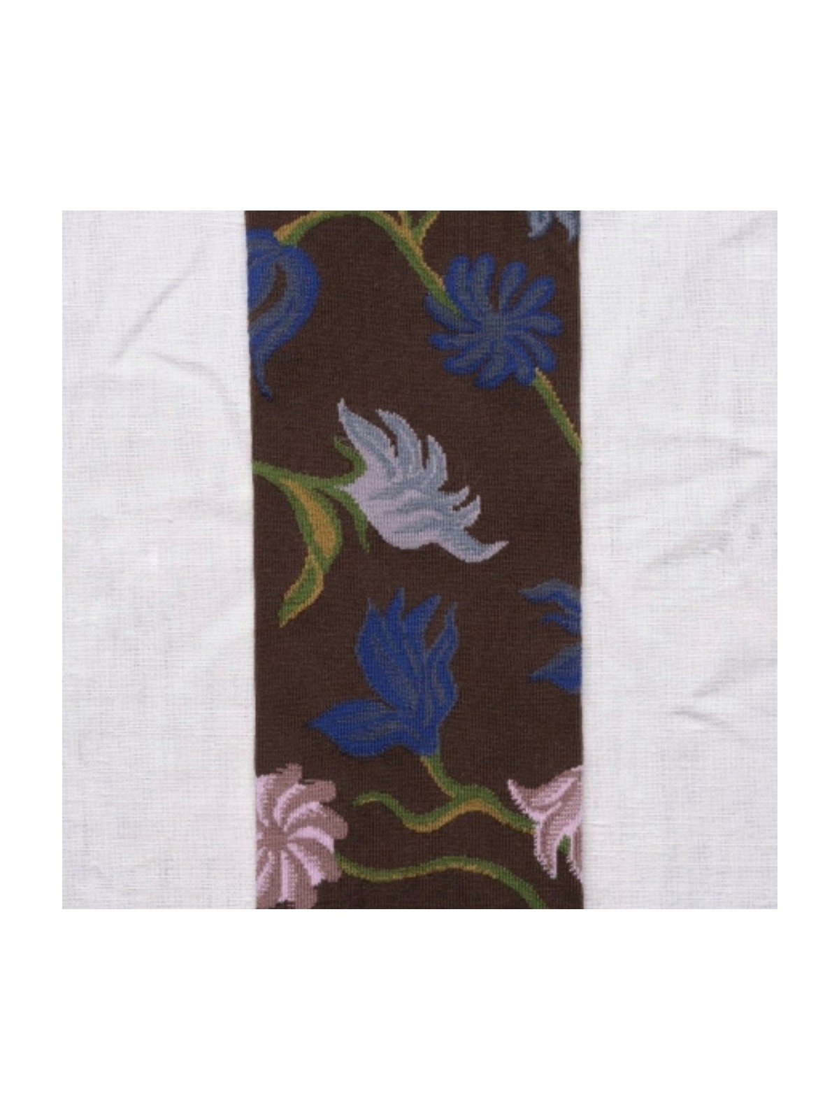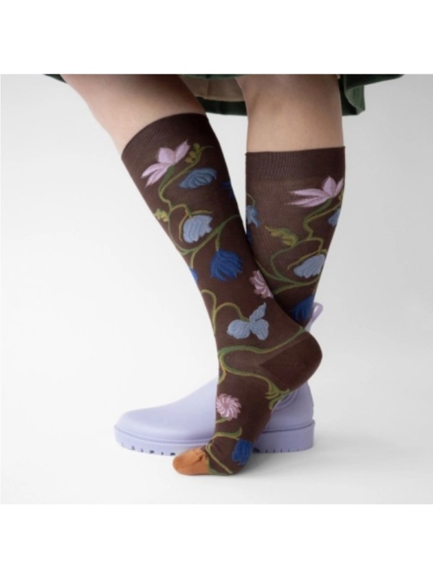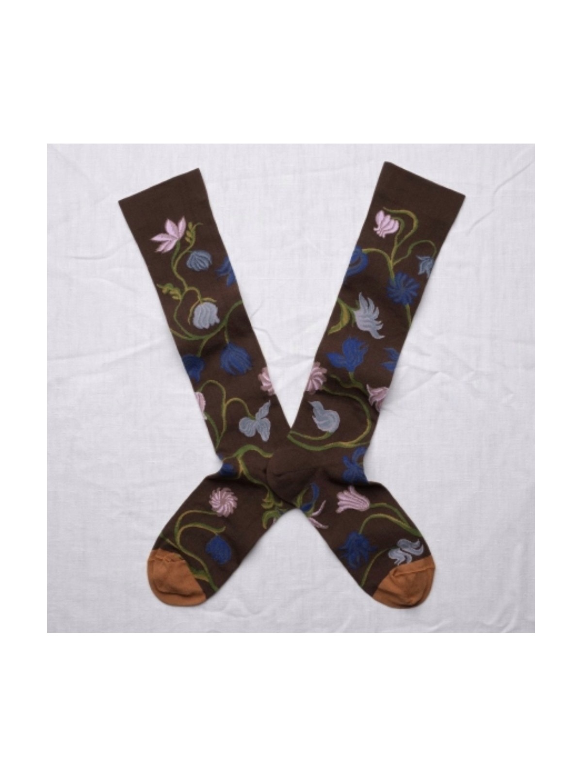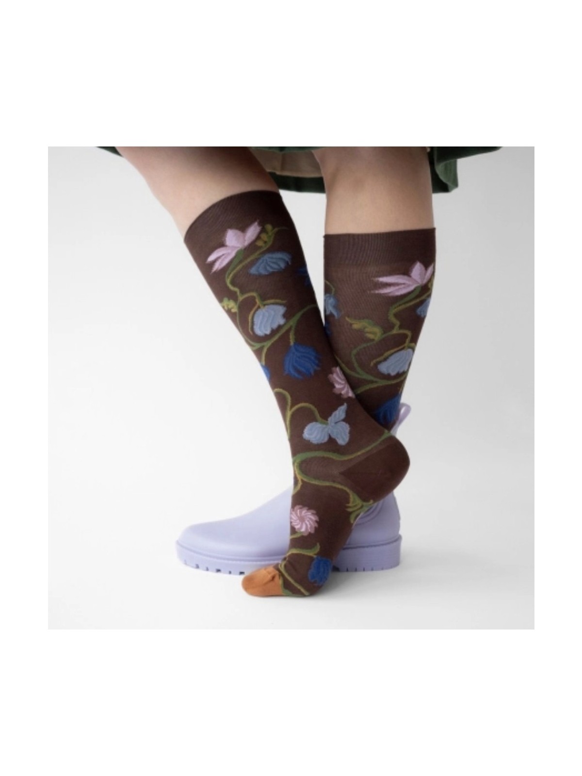 Media con fondo marrón chocolate y estampación multicolor en ocres ,azules y rosas y con la puntera en azulón.Composición: Algodón 90%, Poliester 8%, Elastan 2%-