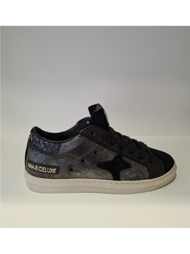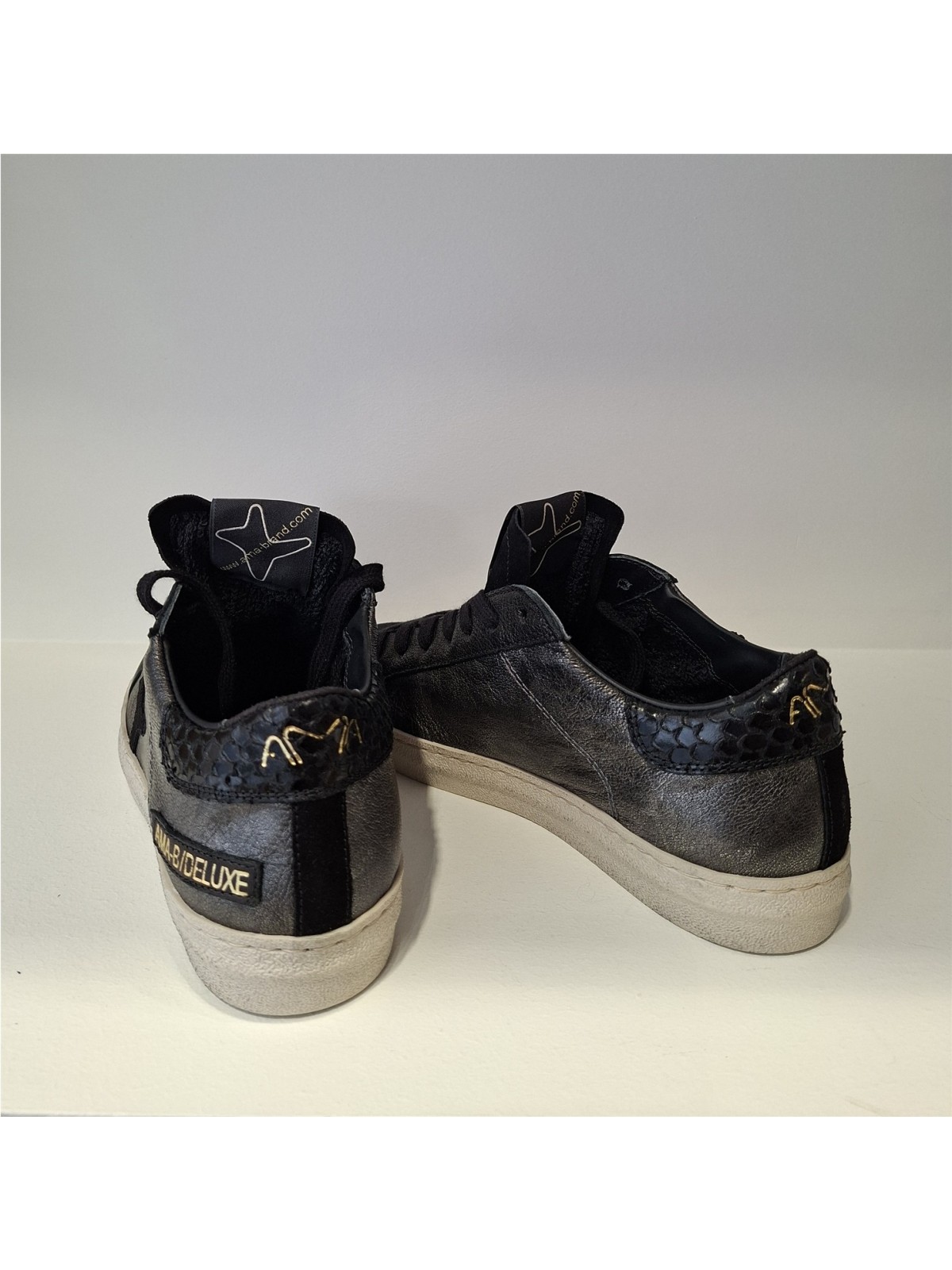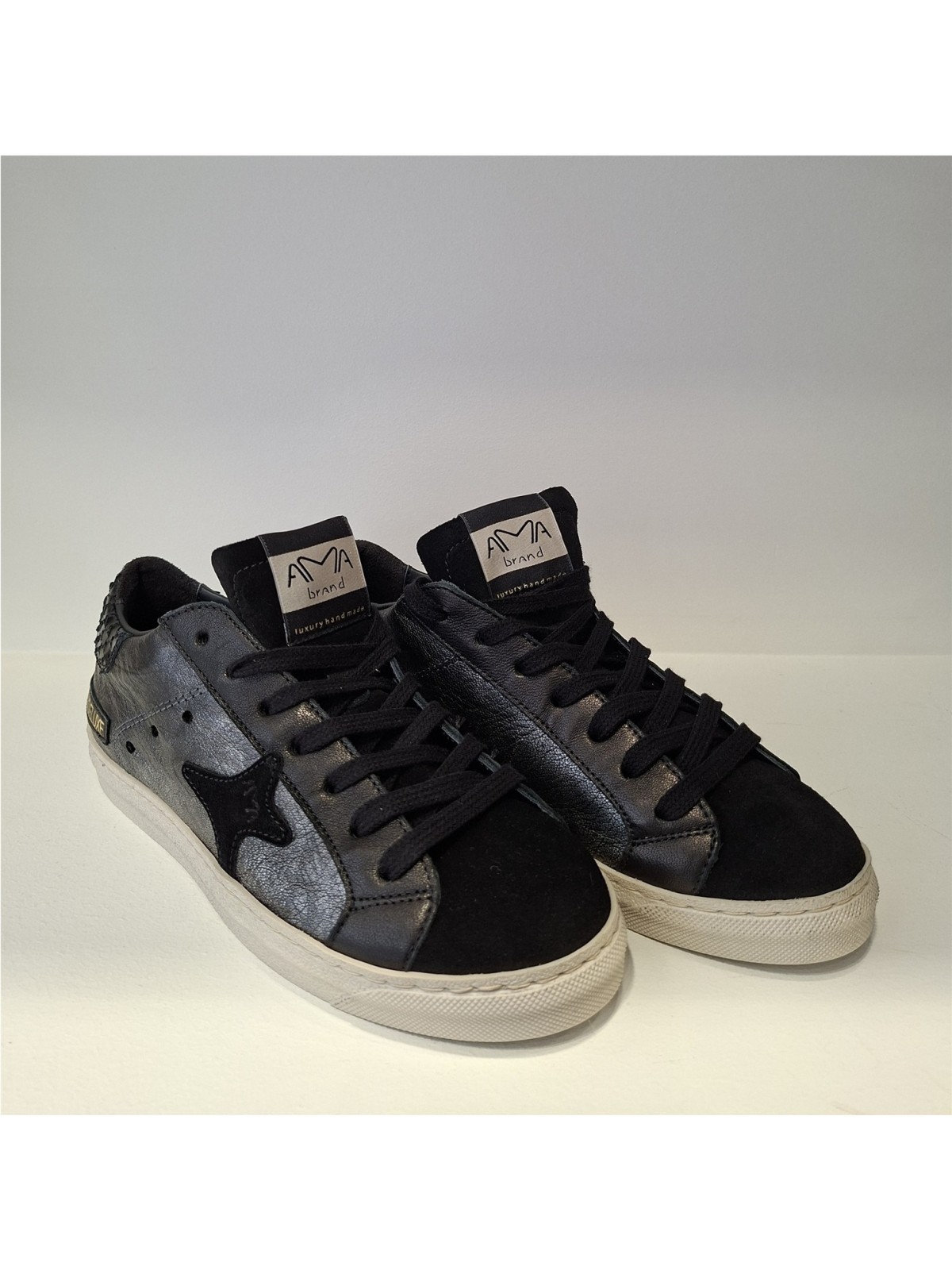 Zapatilla negra que combina piel con brillo y mate y serraje en la parte delantera de la lengueta.En la parte trasera del talón lleva un poco de piel de animal print junto con el logo-nombre de la marca en letras doradas.También tiene el nombre de la marca a un costado.Es una zapatilla de piel 100%, fabricada artesanalmente en Italia.Tallan grandes.