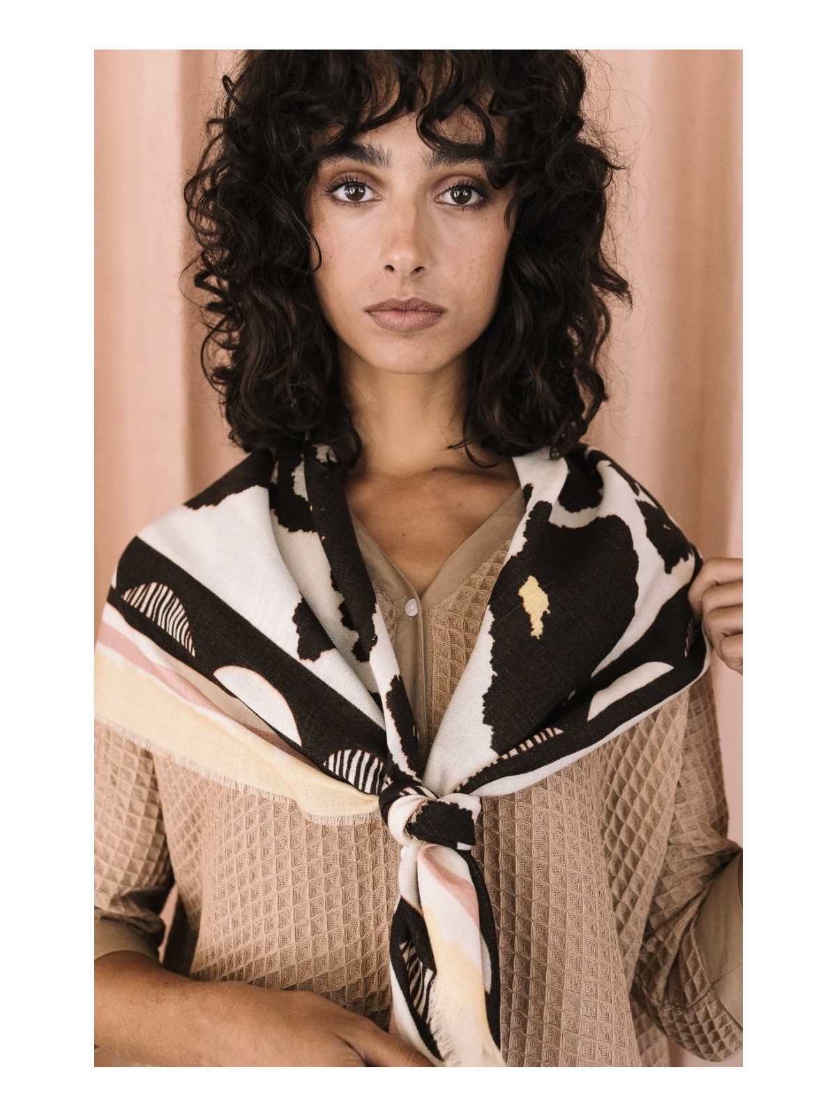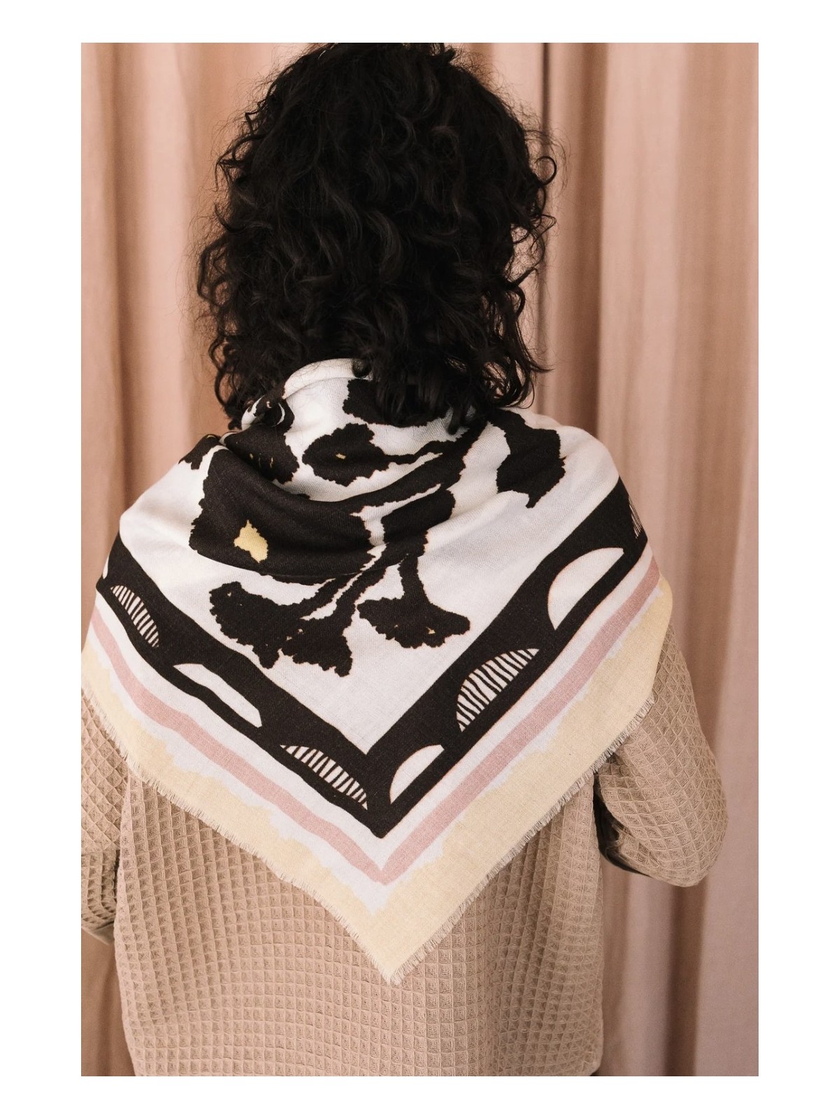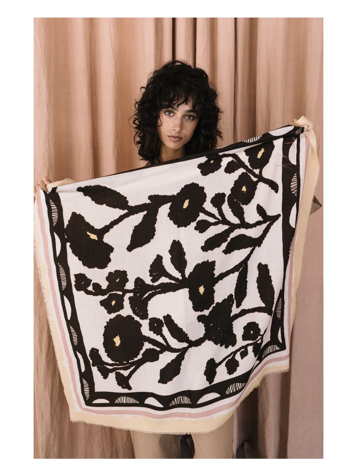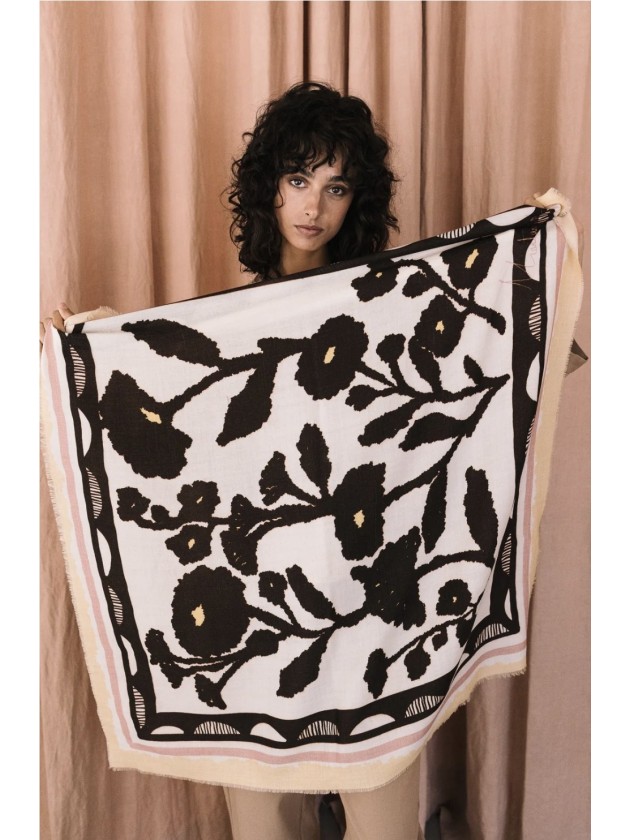 Pañuelo de estampado floral de fondo crudo y estampado chocolate,con un tejido de lana 100% y realizado a mano. Tamaño 100x100.