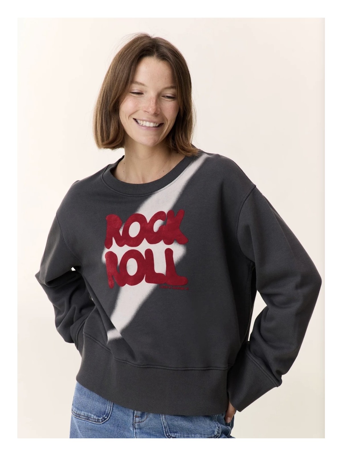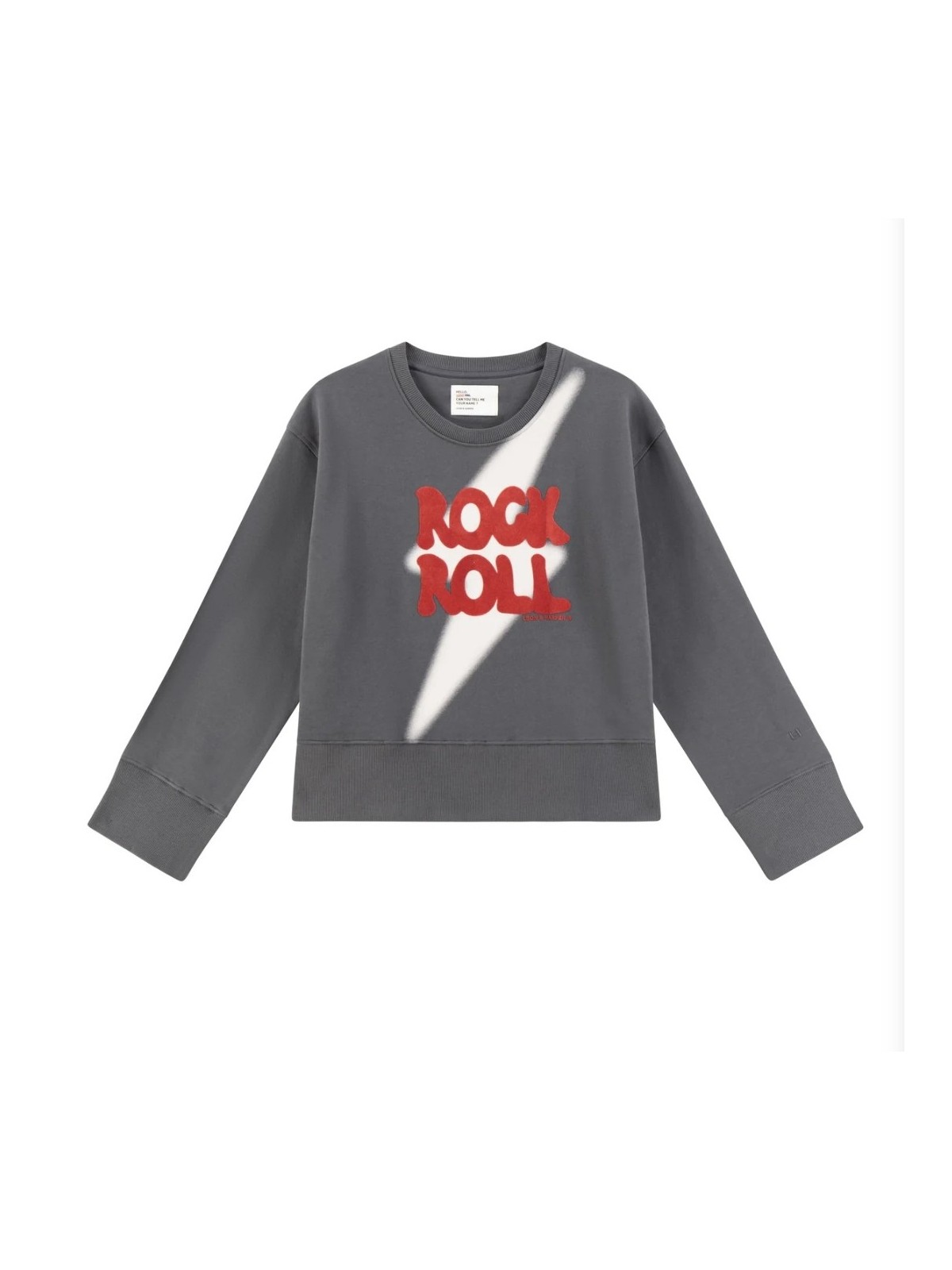 Sudadera gris de escote redondo y manga larga con puño ancho de cenfa.De tipo over da mucha talla.De largo también termina en cenefa ancha.Con letras rojas en la parte frontal.