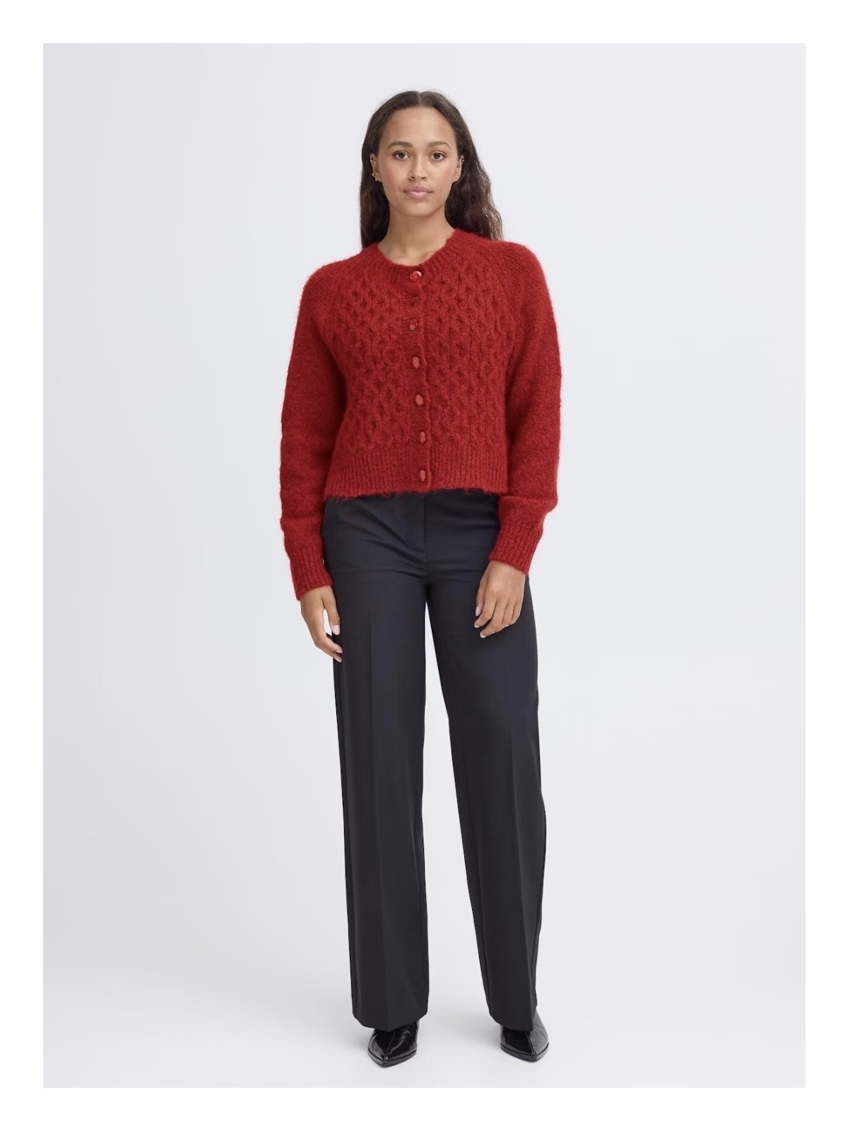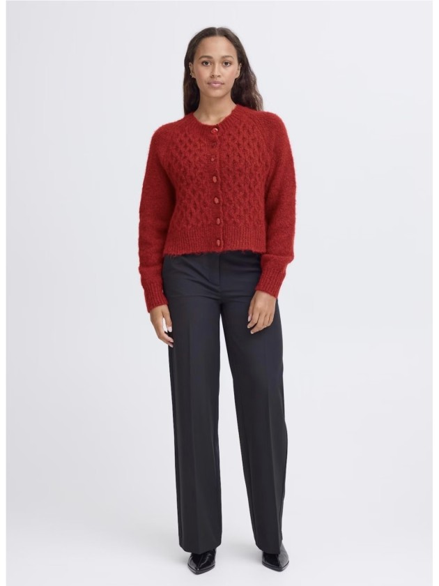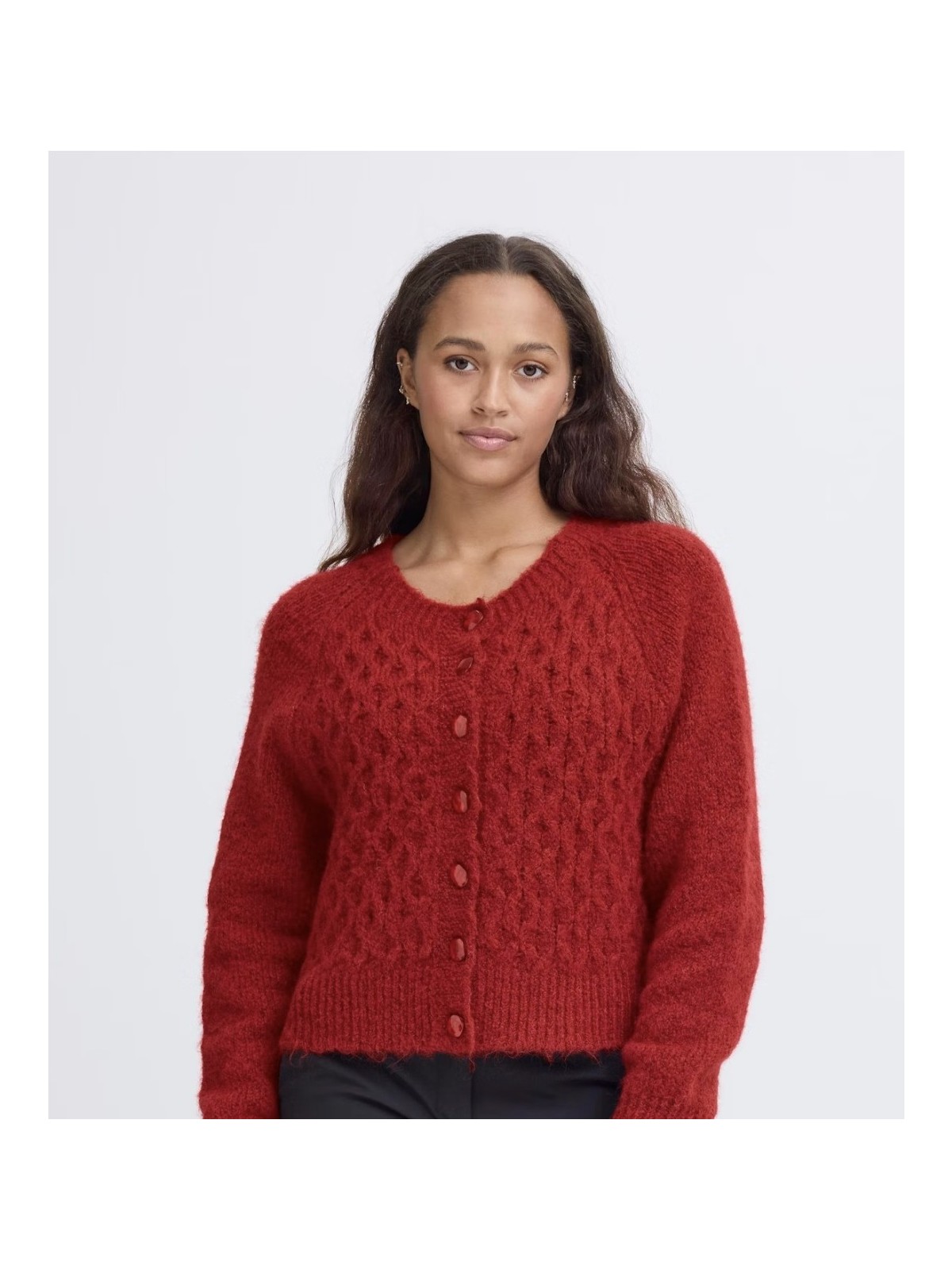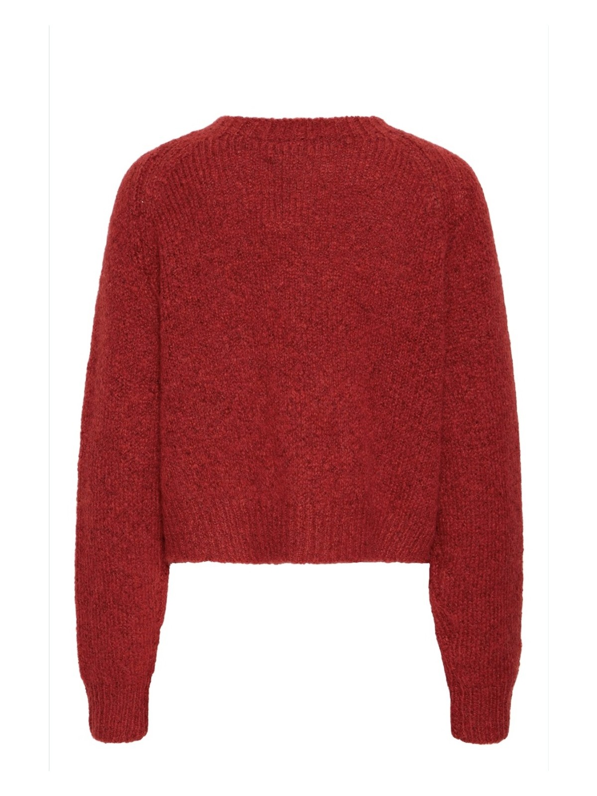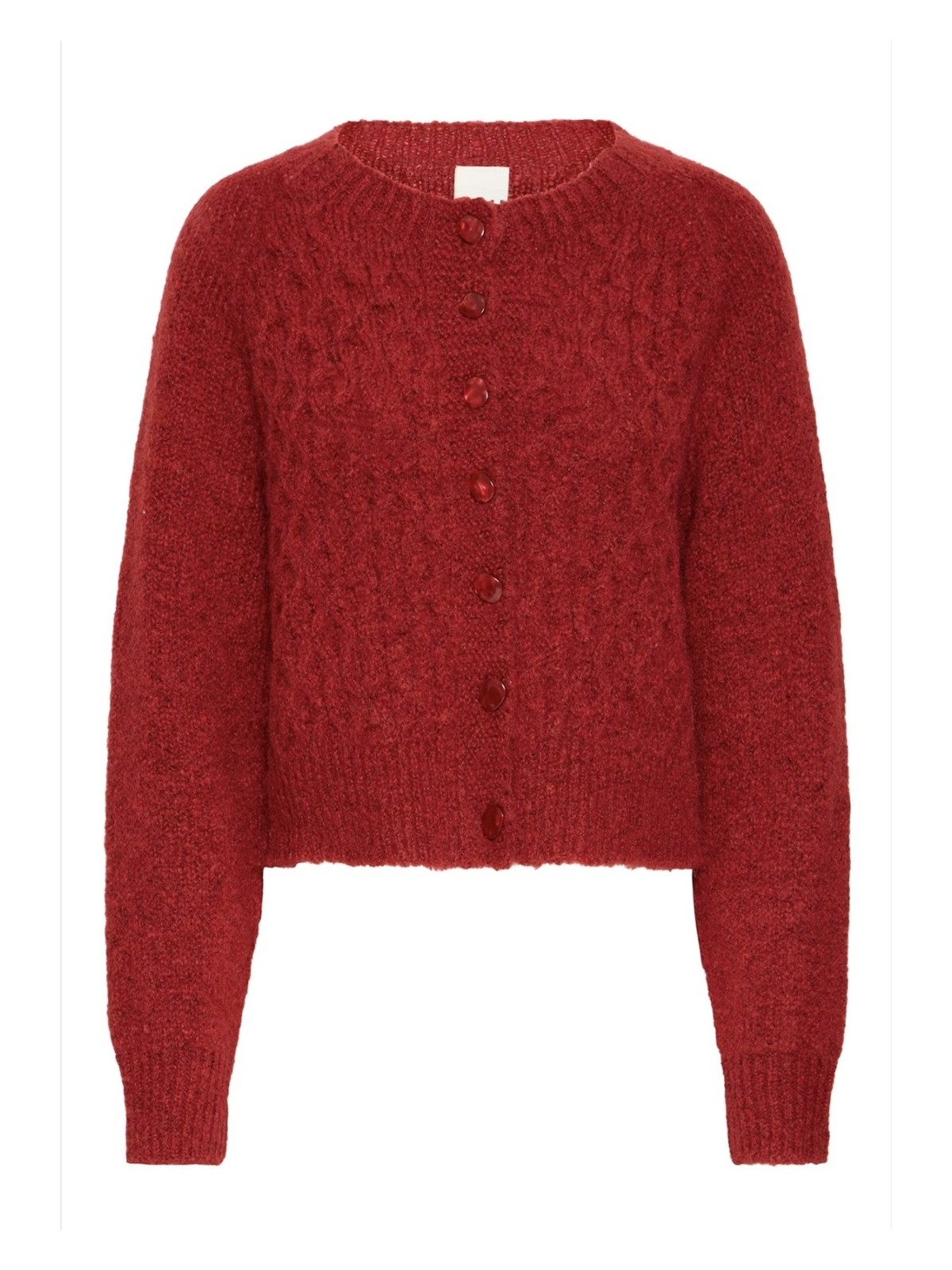 Rebeca granate de punto con lana entrelazada en la parte delantera y va lisa en la parte de la espalda.
