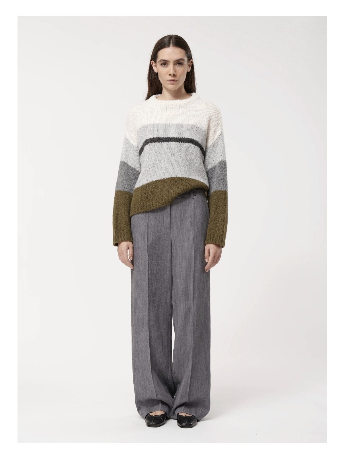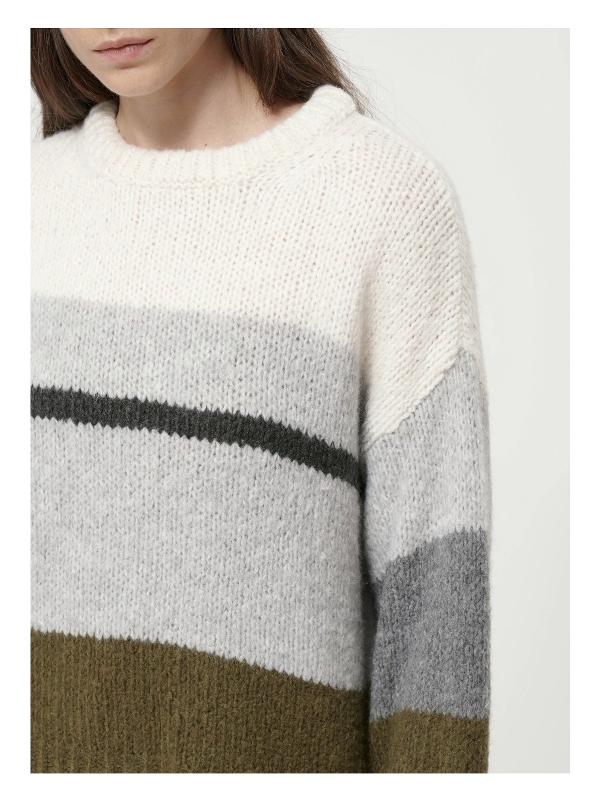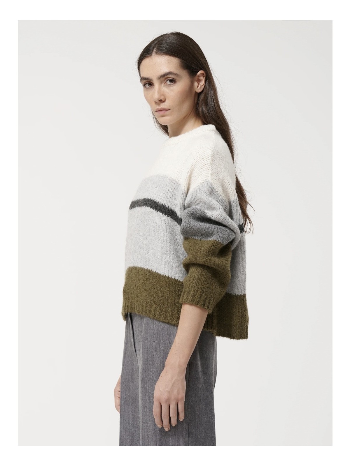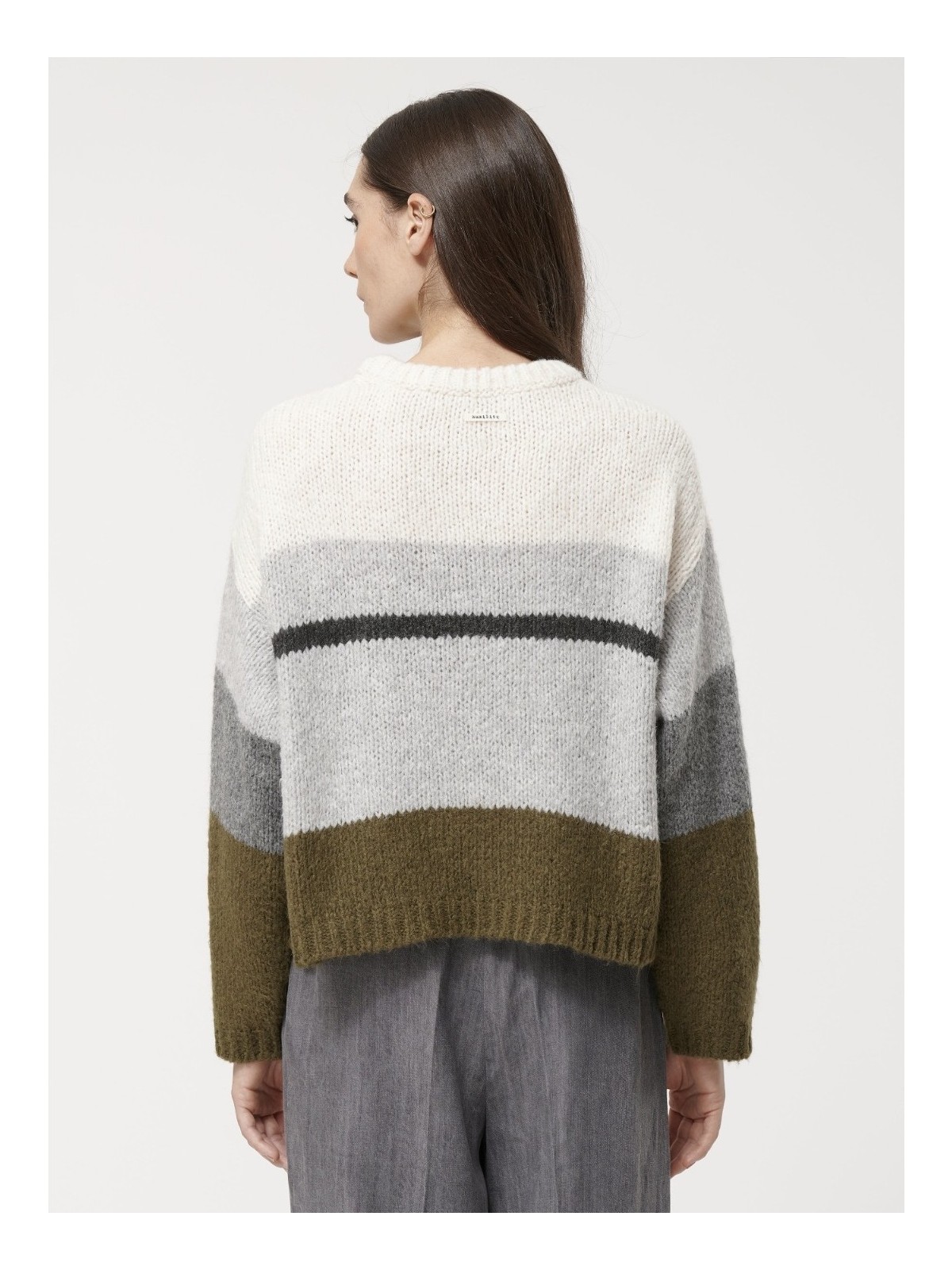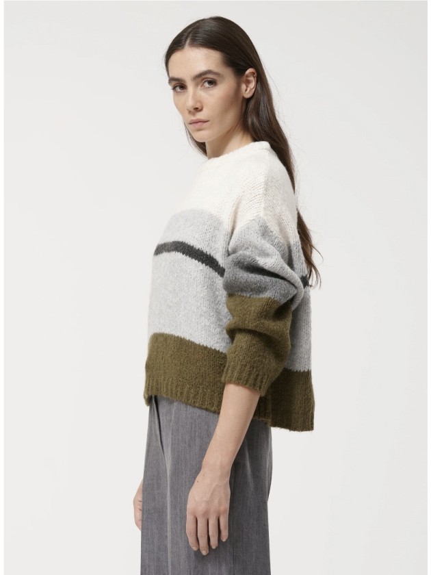 Jersey de punto tricolor crudo, gris y kaki de escote redondo.Es de tipo over por lo que talla amplio.fabricada en Italia.Composición: 64% Acrílico, 20%Poliamida, 8%Viscosa, 8% Lino.
