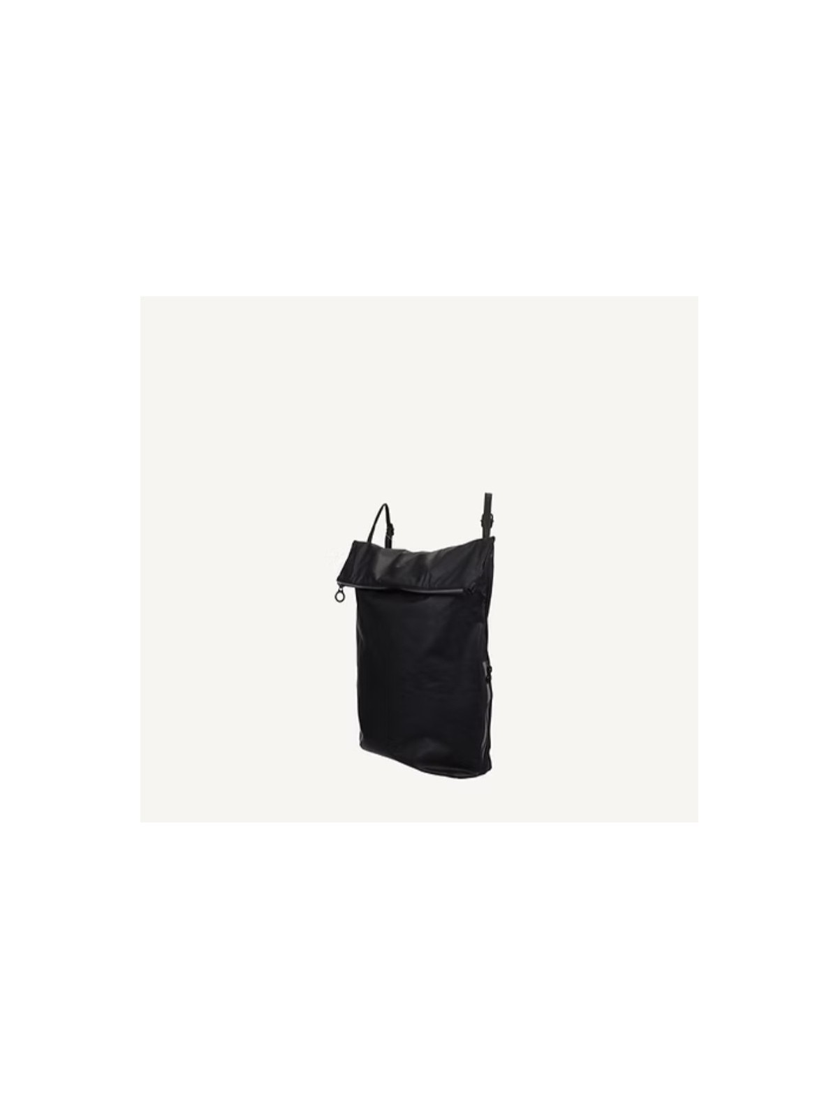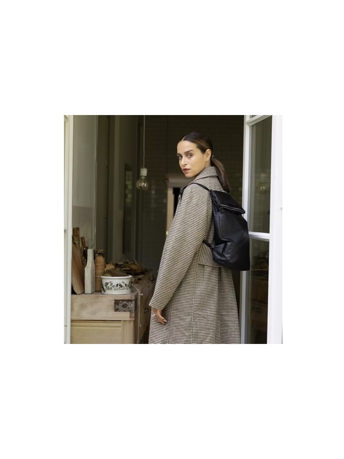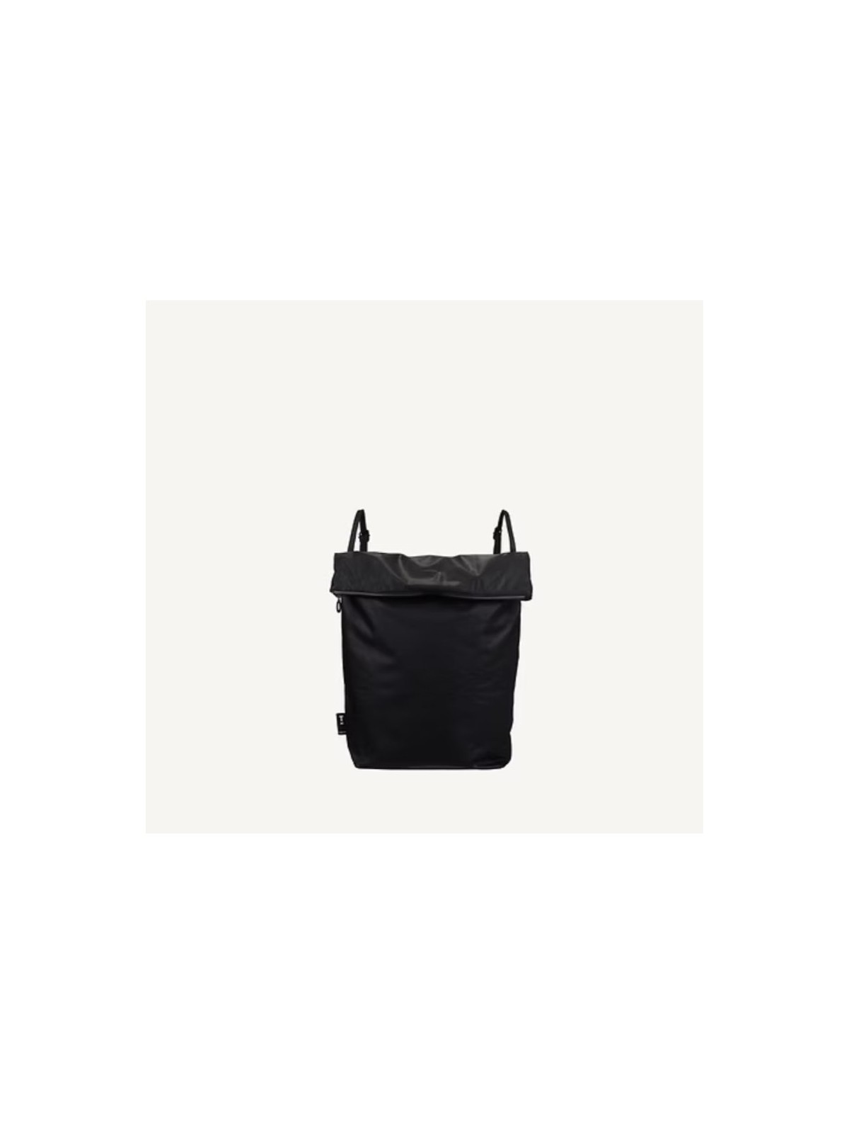 Mochila negra de cuero PU vegano tanto el exterior como las correas. El forro es de nylon impermeable, de una calidad resistente. Tamaño 36x10x48 centímetros.
