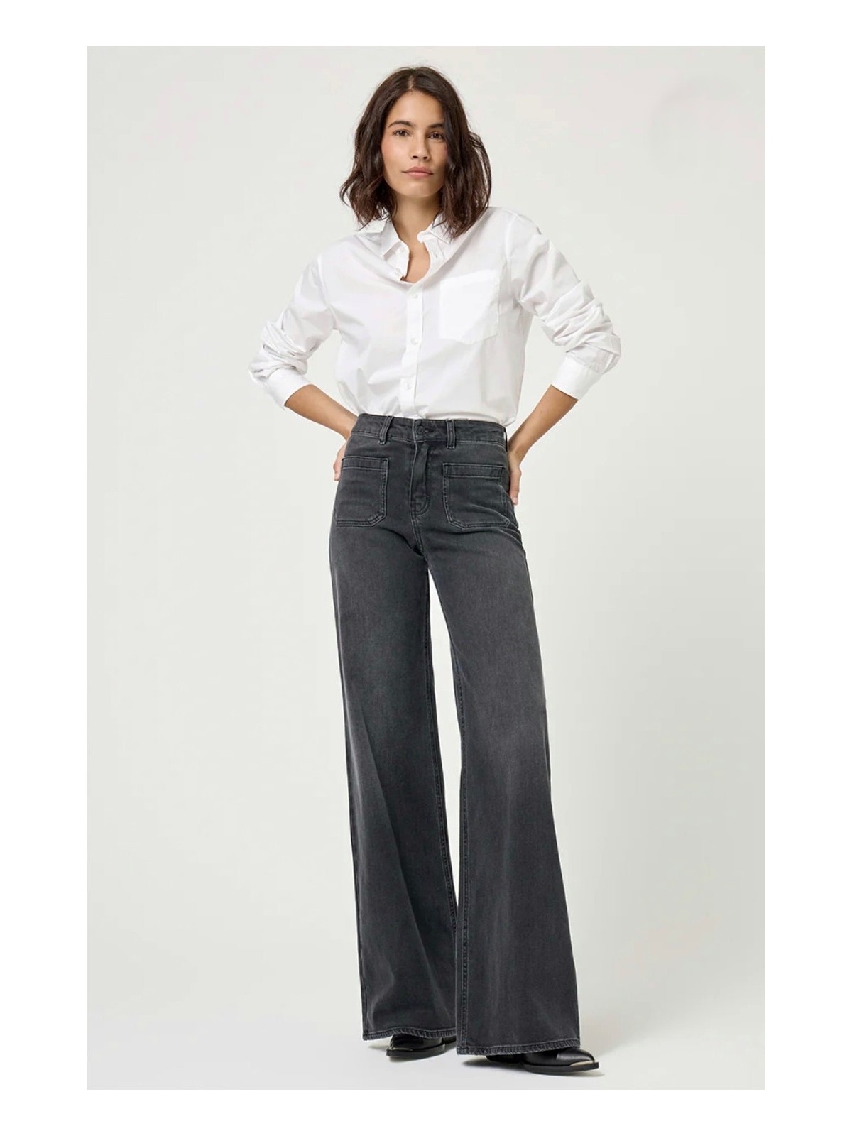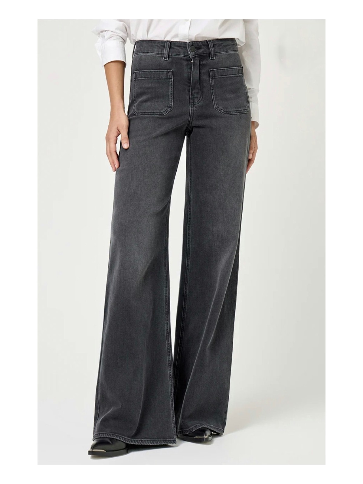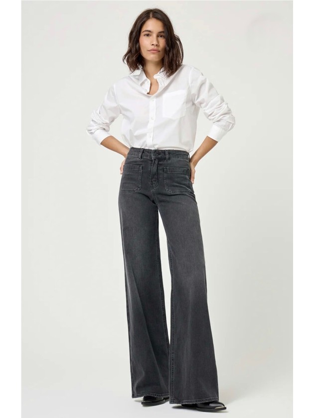 Pantalón vaquero largo gris de pata ancha y cintura alta con bolsillos en la parte delantera y en la parte trasera. De tejido elástico es un modelo que talla amplio.