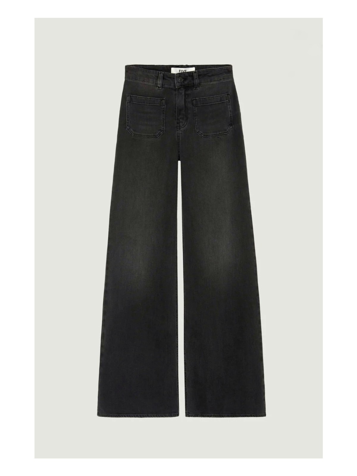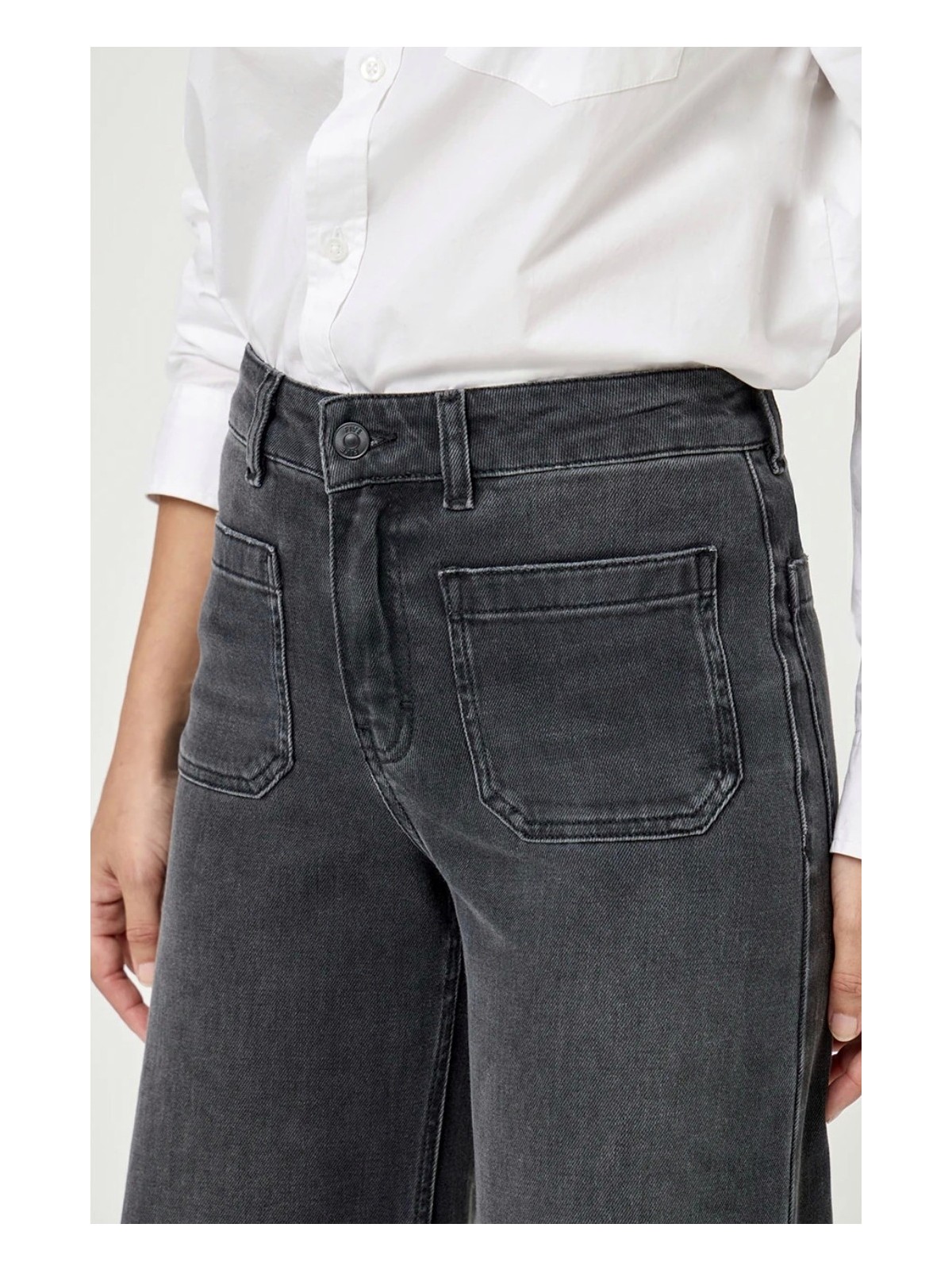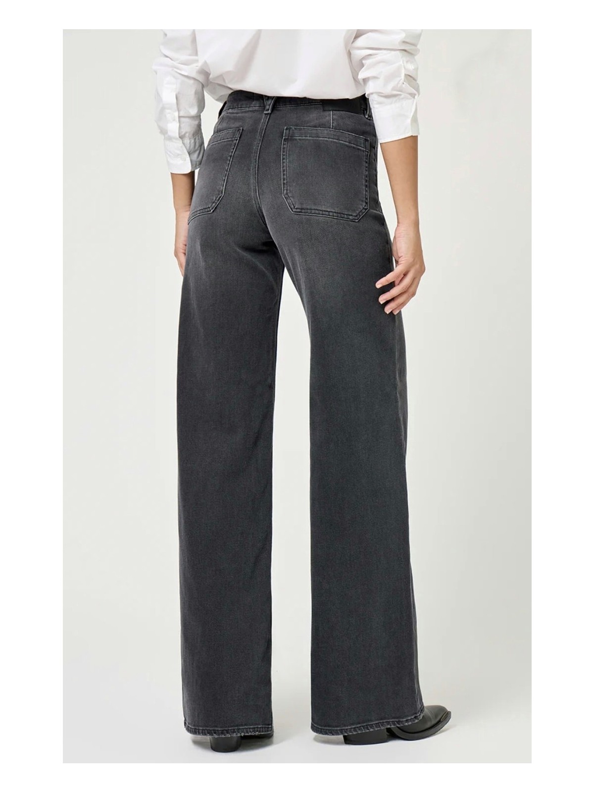 Pantalón vaquero largo gris de pata ancha y cintura alta con bolsillos en la parte delantera y en la parte trasera. De tejido elástico es un modelo que talla amplio.
