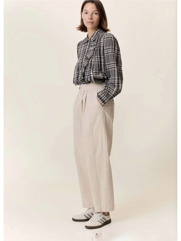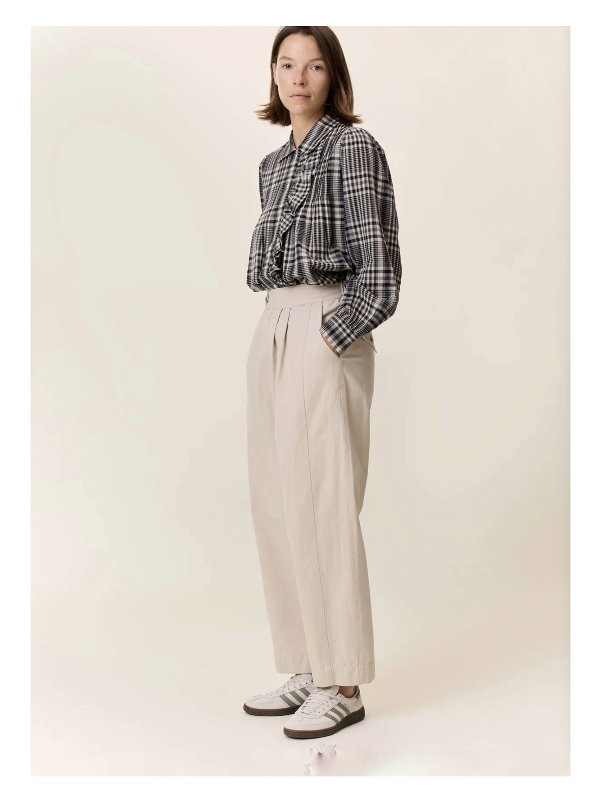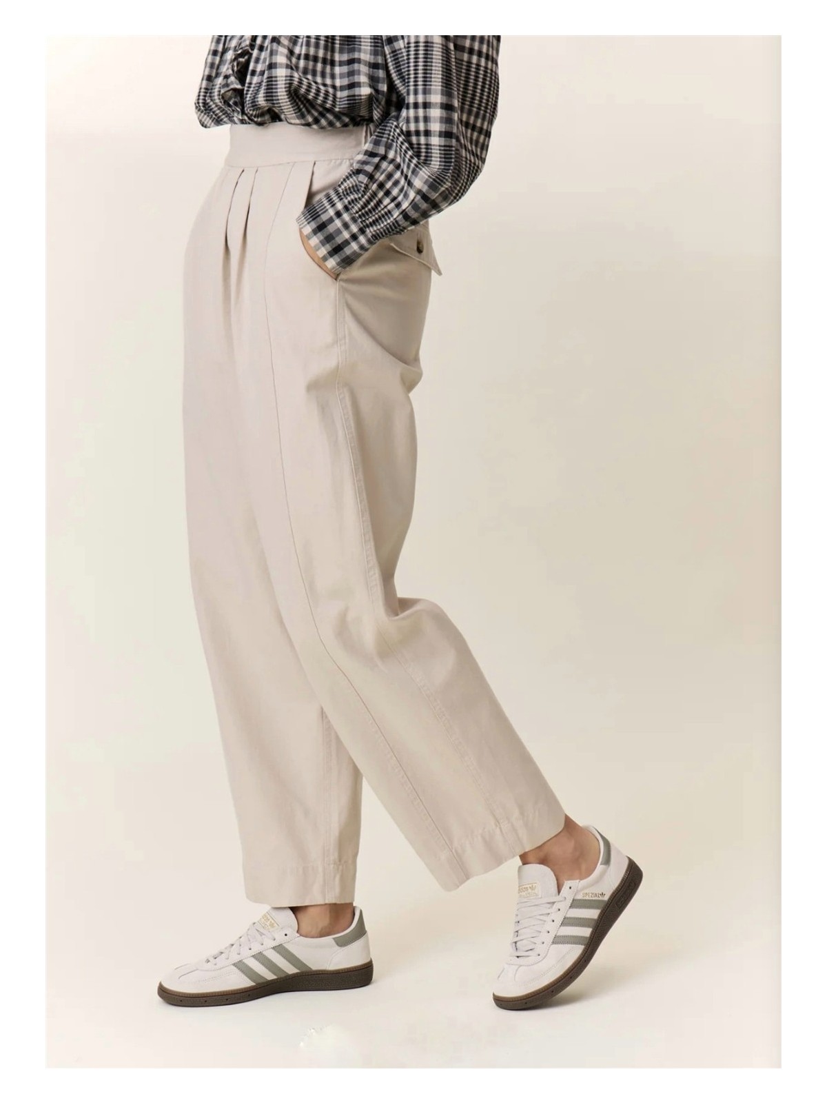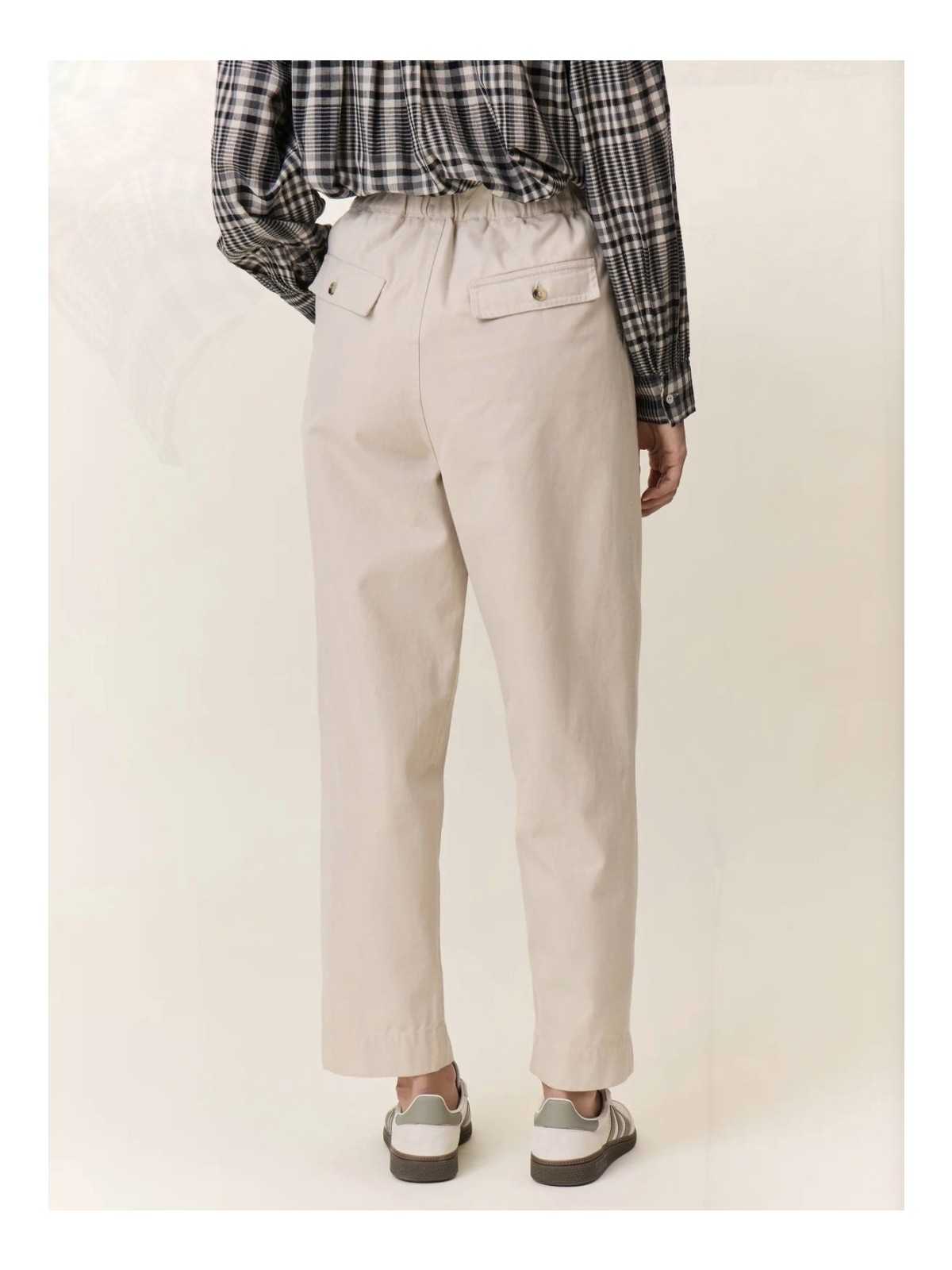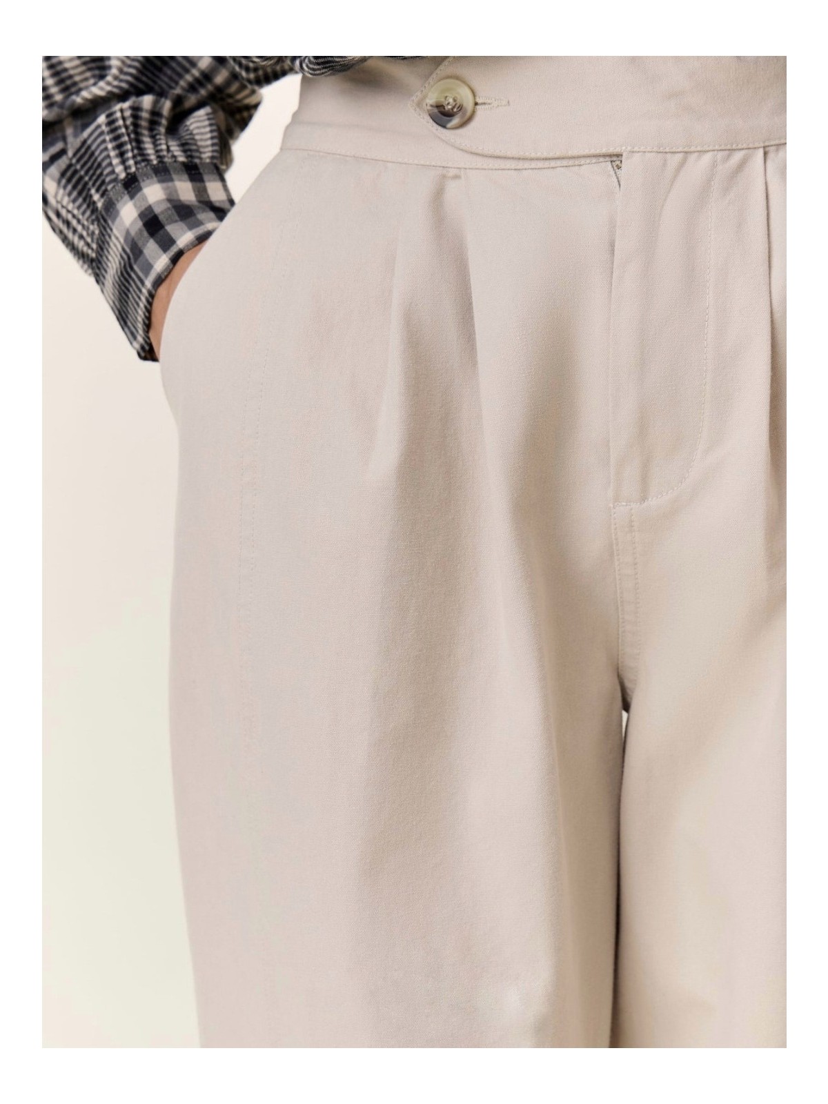 Pantalón de pinzas de color hielo en un tejido de algodón con caída que le dá un toque de vestir. Con bolsillos laterales y de tapeta en la parte de atrás con botón. De cintura alta que se cierra con cremallera y con botón a un costado.Lleva goma en la parte de atrás. Algodón 100%.